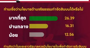 สำนักวิจัยสยามเทคโนโพล วิทยาลัยเทคโนโลยีสยาม เปิดเผยผลสำรวจของประชาชน เรื่อง “นโยบายด้านจริยธรรมกำจัดสินบนได้หรือไม่” ทำการสำรวจระหว่างวันที่ 23–30 มกราคม 2567 จากประชาชนที่มีอายุ 18 ปีขึ้นไป กระจายทุกภูมิภาค ระดับการศึกษา อาชีพ และรายได้ ทั่วประเทศ รวมทั้งสิ้น จำนวน 1,330 หน่วยตัวอย่าง เกี่ยวกับความคิดเห็นนโยบายด้านจริยธรรมกำจัดสินบนได้หรือไม่ การสำรวจอาศัยการสุ่มตัวอย่างโดยใช้ความน่าจะเป็นจากบัญชีรายชื่อฐานข้อมูลตัวอย่างหลัก (Master Sample) ของ “สยามเทคโนโพล” สุ่มตัวอย่างแบบหลายขั้นตอน (Multi-Stage Sampling) เก็บข้อมูลด้วยวิธีการสัมภาษณ์ทางโทรศัพท์ และโปรแกรม Google Form โดยกำหนดค่าความเชื่อมั่น ร้อยละ 95.00 จากการสำรวจเมื่อถามความคิดเห็นของประชาชนที่มีอายุ 18 ปี ขึ้นไป เกี่ยวกับนโยบายด้านจริยธรรมกำจัดสินบนได้หรือไม่ พบว่า ตัวอย่าง ร้อยละ 26.39 ระบุว่า เชื่อว่านโยบายด้านจริยธรรมกำจัดสินบนได้ในระดับมากที่สุด มากที่สุด รองลงมา …