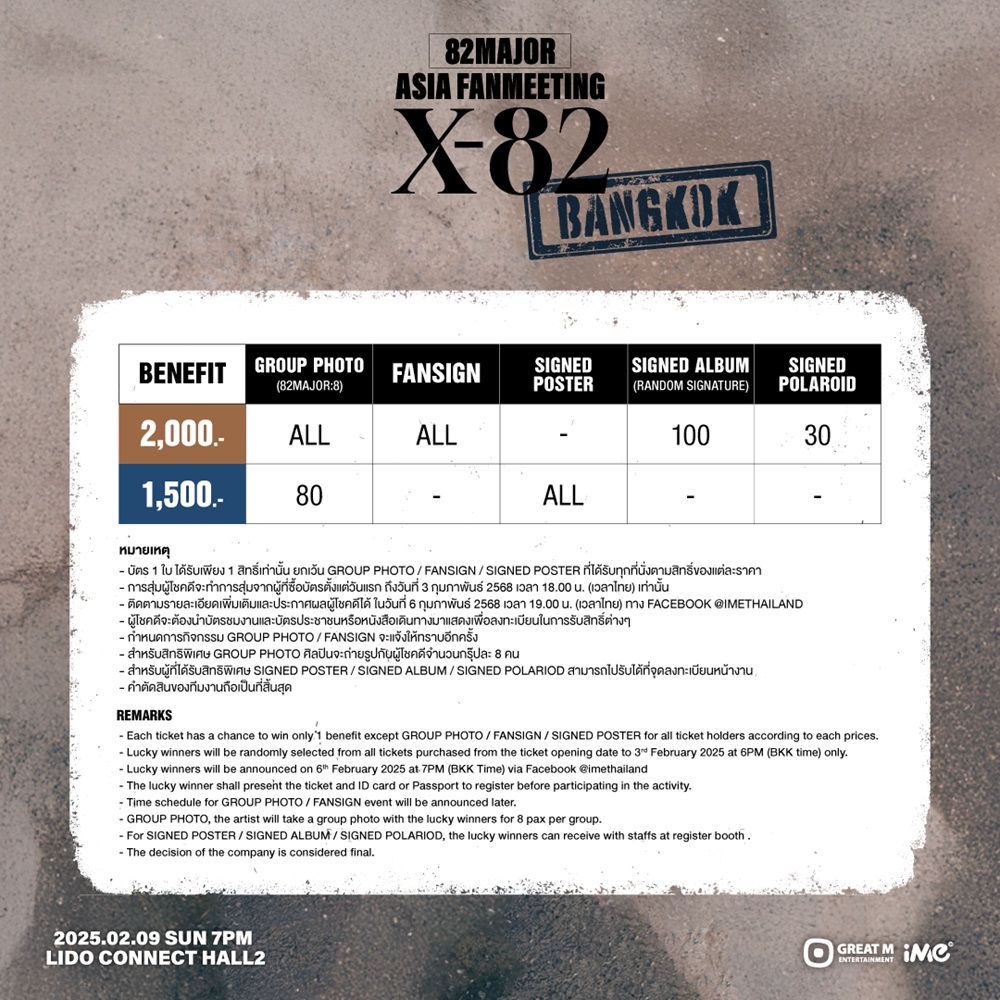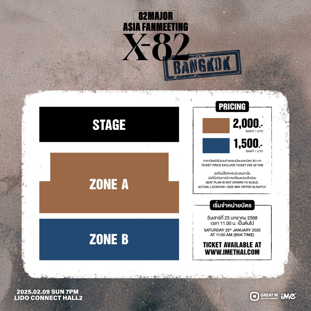 ย้ำอีกครั้ง! “82MAJOR” ดีใจ และตื่นเต้นสุดๆ ที่จะได้มามอบความสุขให้แฟนคลับที่เมืองไทยในงาน “2025 82MAJOR <X-82> ASIA FAN MEETING in BANGKOK” ซึ่งจะจัดขึ้นในวันอาทิตย์ที่ 9 กุมภาพันธ์ 2568 ณ LIDO CONNECT HALL2 แฟนๆ สามารถติดตามรายละเอียดเพิ่มเติมได้ที่ Facebook @imethailand, IG และ Twitter @ime_th