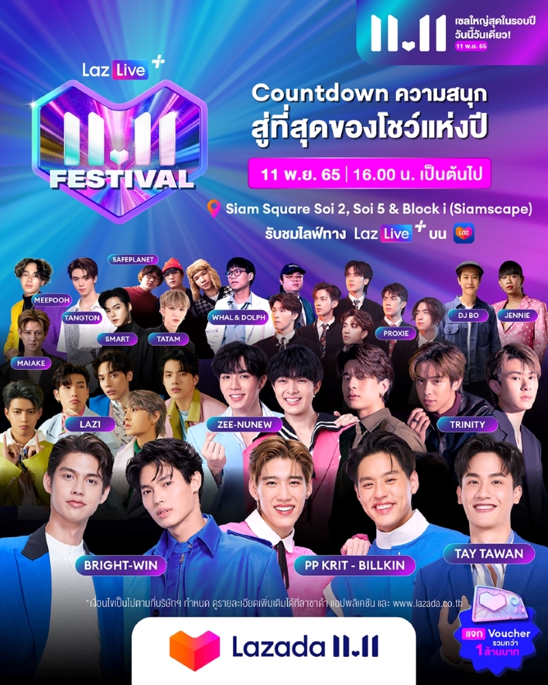 ยังไม่หมดเพียงเท่านี้! ในดีเดย์ วันที่ 11 พฤศจิกายน นักช้อปเตรียมพบกับเวทีคอนเสิร์ตใหญ่ที่สุดแห่งปีจากลาซาด้า รวบรวมศิลปินแนวหน้าของเมืองไทยกว่า 30 ชีวิต ไม่ว่าจะเป็น ไบร์ท – วชิรวิชญ์, วิน – เมธวิน, พีพี – กฤษฏ์, บิวกิ้น – พุฒิพงศ์, Whal & Dolph, Safe Planet, LAZ iCON, PROXIE, ซี พฤกษ์, นุนิว ชวรินทร์, LAZ1, เต ตะวัน, Trinity และอีกมากมาย ที่จะเรียงแถวมามอบความบันเทิงแบบนอนสต็อป จัดเต็มตลอด 6 ชั่วโมง ตั้งแต่เวลา 16.00 น. ณ ลานกิจกรรม Block I สยามสแควร์ โดยนักช้อปสามารถลุ้นรับบัตรชมคอนเสิร์ตได้ง่าย ๆ เพียง แชะ & แชร์ ถ่ายภาพที่ LazLive+ Festival กับ 3 กล่องเซอร์ไพรส์ที่สยามสแควร์ ซอย 5 ให้ครบ และอัปโหลดลงโซเซียลพร้อมติด #Lazada1111Festival หรือร่วมกิจกรรมอื่น ๆ อีกมากมายเพื่อลุ้นรับบัตร นอกจากนี้ ลาซาด้ายังเตรียม Public Zone บริเวณสยามสแควร์ซอย 2 ให้แฟน ๆ ที่ไม่มีบัตรได้ฟินกับคอนเสิร์ตครั้งใหญ่ หรือจะรับชมไลฟ์ผ่าน LazLive+ บนแอปพลิเคชันลาซาด้า โดยผู้ชมยังมีสิทธิ์ลุ้นเซอร์ไพรส์สุดพิเศษกับคูปองและของรางวัลที่ลาซาด้าเตรียมมาแจกแบบจุก ๆ มูลค่ารวมกว่า 1 ล้านบาทอีกด้วย ติดตามรายละเอียดและกติกาเพิ่มเติมได้ที่ช่องทางโซเชียลของลาซาด้า @Lazada_TH ทุกช่องทาง