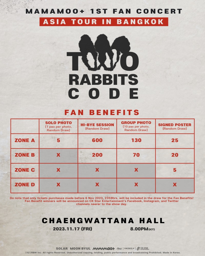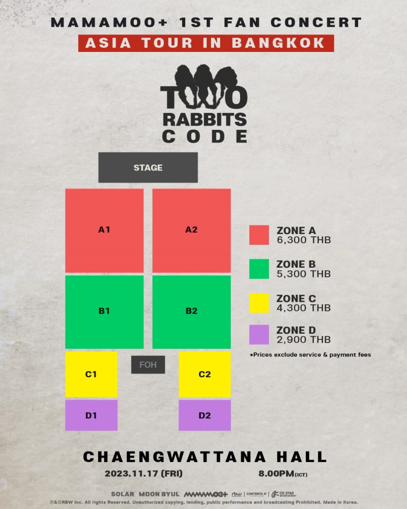 ‘MAMAMOO+ 1ST FAN CONCERT [TWO RABBITS CODE] – ASIA TOUR in BANGKOK’ (มามามูพลัส เฟริส แฟน คอนเสิร์ต [ทู แรพบิท โค้ด] – เอเชียทัวร์ อิน แบงค์คอก) จะเปิดจำหน่ายในวันพฤหัสบดีที่ 19 ตุลาคมนี้ เวลา 12.00 น. ผ่านทาง www.ticketmelon.com