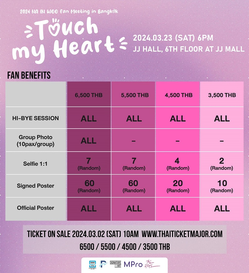 ผู้จัด Terminal Xtra Entertainment ไม่รอช้า คว้าตัว “นาอึนอู” มาเจอแฟนๆ ชาวไทยทันที ถือเป็นแฟนมีตติ้งที่แรกหลังซีรีส์จบ กับงาน 2024 NA IN WOO Fanmeeting IN BANGKOK “Touch my heart” วันที่ 23 มีนาคม 2567 ที่ JJ Hall ชั้น 6, JJ Mall จำหน่ายบัตรวันที่ 2 มีนาคม 2567 บัตรราคา 6500, 5500, 4500 และ 3500 บาท ทาง Thaiticket Major พร้อมรับสิทธิพิเศษ อาทิ HI BYE, SELFIE PHOTO, GROUP PHOTO และ SIGNED POSTER