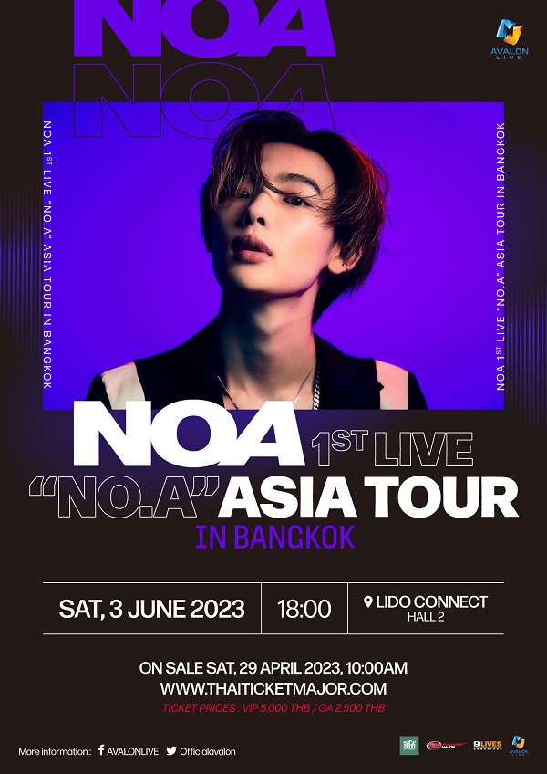 สาวๆ ชาวไทย กุมหัวใจกันให้ดีๆ เพราะโนอา หนุ่มหล่อมากความสามารถคนนี้ และ Avalon Live พร้อมแล้วที่จะมาสร้างสรรค์คอนเสิร์ตคุณภาพคับฮอลล์ NOA 1st LIVE “NO.A” ASIA TOUR IN BANGKOK กาปฏิทิน เตรียมตัวคว้าบัตรกันให้ดีๆ เพราะงานนี้บัตรมีจำนวนจำกัด และเป็นบัตรยืนทั้งหมด โดยมีทั้งบัตร VIP ราคา 5,000 บาท (จำนวนจำกัด) และบัตร General Admission ราคา 2,500 บาท (ราคายังไม่รวมค่าธรรมเนียมการออกบัตร) เริ่มจำหน่ายบัตรในวันเสาร์ที่ 29 เมษายน 2566 เวลา 10.00 น. ทางไทยทิคเก็ตเมเจอร์ทุกสาขาและทาง www.thaiticketmajor.com ติดตามรายละเอียดเพิ่มเติมอื่นๆ ได้ทาง FB/AvalonLive และ Twitter @OfficialAvalon