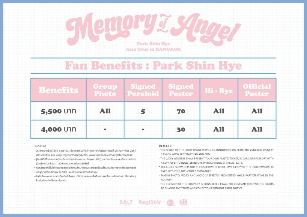 ทำเอาแฟนๆ ชาวไทยตื่นเต้นไม่น้อย หลังจากผู้จัด RegiStar ประกาศจัดงานแฟนมีตติ้งของนักแสดงสาวเจ้าของรอยยิ้มหวาน “พัคชินฮเย” กับงาน “2024 PARK SHIN HYE ASIA TOUR in BANGKOK” [Memory of Angel] ซึ่งจะจัดในวันอาทิตย์ที่ 3 มีนาคม พ.ศ. 2567 ณ ลิโด้ คอนเน็คท์ สยามแควร์ บัตรราคา 5,500 บาท และ 4, 000 บาท พร้อมสิทธิพิเศษมากมาย