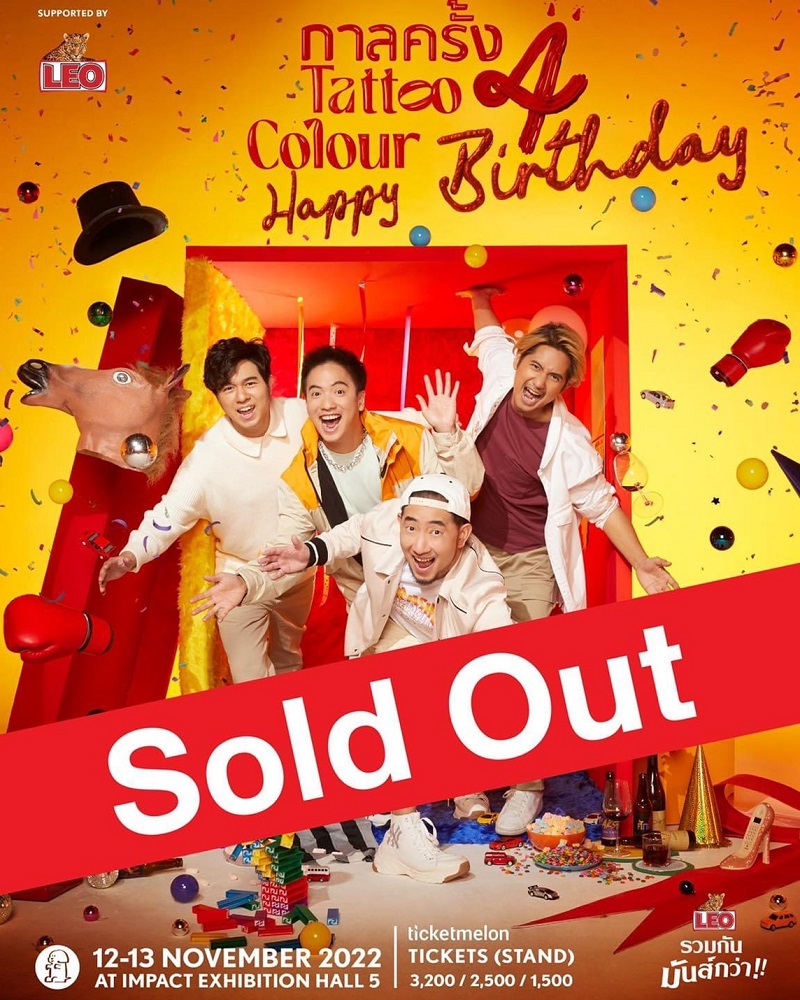 คอนเสิร์ตสุดปังของอีกหนึ่งวงดนตรีป็อบสายเอ็นที่มาแรงแบบสุด ๆ ในตอนนี้ จนมีแฟนเพลงอย่างล้นหลามและมีการเรียกตัวเอง ว่า “ชาวนัว” ของศิลปิน แทททู คัลเลอร์ จากค่ายเพลงอินดี้ห้องเล็กๆ สมอลล์รูม นำโดย ดิม-รัฐ-ตง-จั๊ม ที่ได้ประกาศคอนเสิร์ตใหญ่เต็มรูปแบบในรอบเกือบ 10 ปี โดยใช้ชื่อคอนเสิร์ตว่า “กาลครั้ง 4 TATTOO COLOUR HAPPY BIRTHDAY” ที่จะถูกจัดขึ้นในวันที่ 12 และ 13 พฤศจิกายน 2565 ณ IMPACT Exhibition Hall 5 (เมืองทองธานี) โดยหลังจากเปิดขายบัตรไปในวันที่ 5 สิงหาคม ช่วง 12.00 น.ที่ผ่านมา และมีข่าวหลุดออกมาก่อนว่า ได้มีการถูกจับจองหมดทุกโซน ทุกรอบ ภายในเวลา ไม่ถึง 10 นาที และล่าสุดช่องทางโซเชียลต่าง ๆ ของ Smallroom และ Tattoo Colour เอง ก็ได้ออกมาประกาศอย่างเป็นทางการว่าบัตรคอนเสิร์ตทั้งสองรอบนั้นได้ Sold Out เป็นที่เรียบร้อย จนเกิดกระแสเป็นที่พูดถึงในช่องทางต่าง ๆ มากมาย ทำให้แฮชแท็ก #tattoocolourth และ #กาลครั้ง4HappyBirthday ติดเทรนด์ทวิตเตอร์ยอดนิยมในประเทศไทยตั้งแต่ 1 ชั่วโมงแรกหลังเปิดขายบัตร