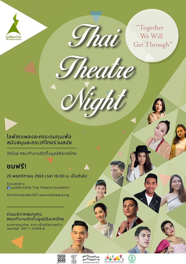 สำหรับงาน Thai Theatre Night 2020 “Together We Will Get Through” จะมีขึ้นในวันพุธที่ 25 พฤศจิกายน 2563 เวลา 19.00 น. เป็นต้นไป รับชมสดได้ทางเฟสบุ๊ก มูลนิธิละครไทย Thai Theatre Foundation โดยไม่มีค่าใช้จ่ายในการรับชม ติดตามรายละเอียดเพิ่มเติมได้ที่ www.thaitheatre.org