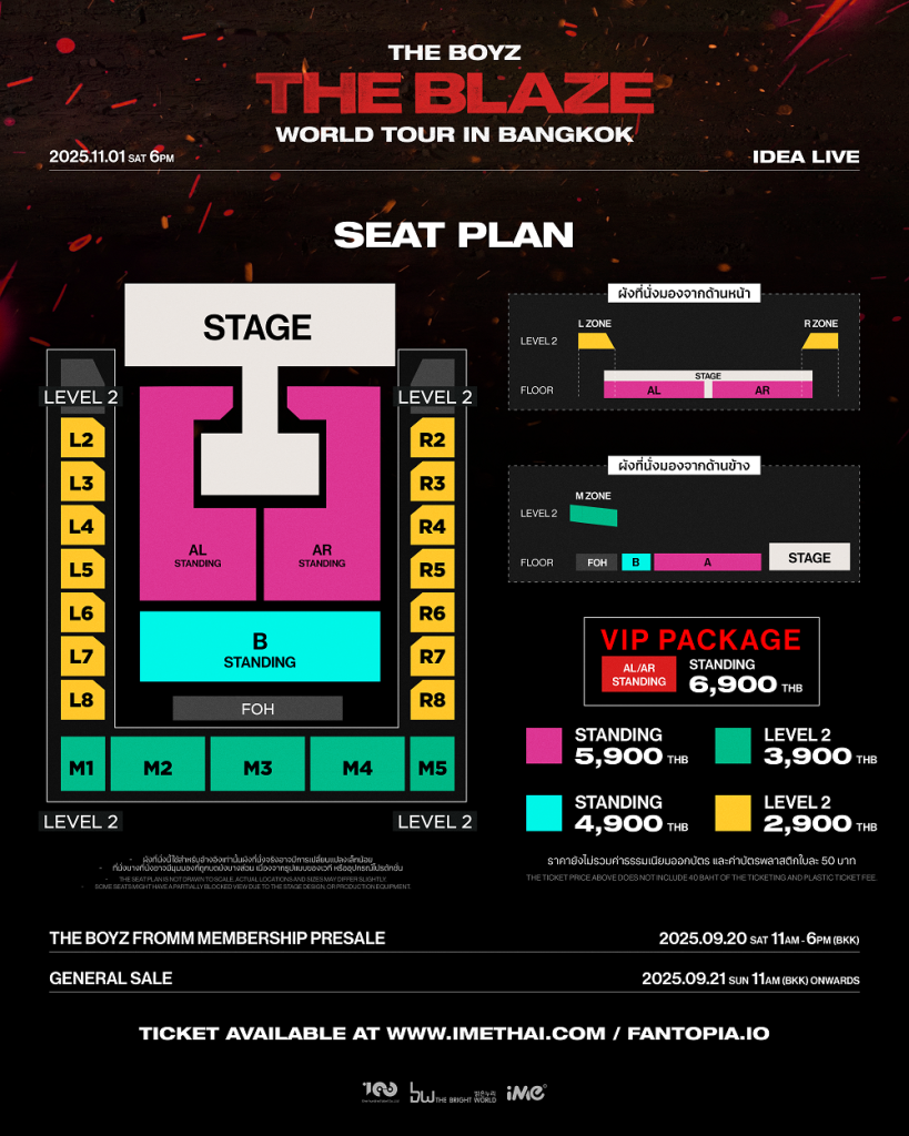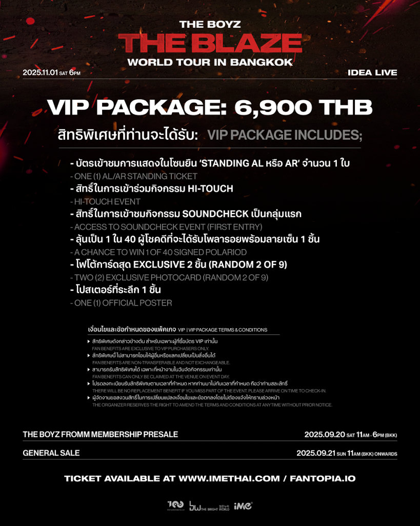 เล็งผังให้ดี! ล็อกโซนที่ชอบ! กดให้ไว! คว้าบัตรให้ทัน!! บัตรราคา : VIP PACKAGE 6,900 (บัตรยืน) / 5,900 (บัตรยืน) / 4,900 (บัตรยืน) / 3,900 / 2,900 บาท จะเปิดจำหน่ายบัตรรอบ “THE BOYZ Fromm Membership” Presale ในวันเสาร์ที่ 20 กันยายน 2568 เวลา 11.00 น. – 18:00 น. (ภายใน 7 ชั่วโมง) ผ่านทาง www.imethai.com เท่านั้น และจะเปิดจำหน่ายบัตรรอบทั่วไป ในวันอาทิตย์ที่ 21 กันยายน 2568 เวลา 11.00 น. เป็นต้นไป ผ่านทาง www.imethai.com / www.fantopia.io สามารถติดตามรายละเอียดงานเพิ่มเติมได้ผ่านช่องทาง Facebook และ TikTok: @imethailand / X และ Instagram: @ime_th