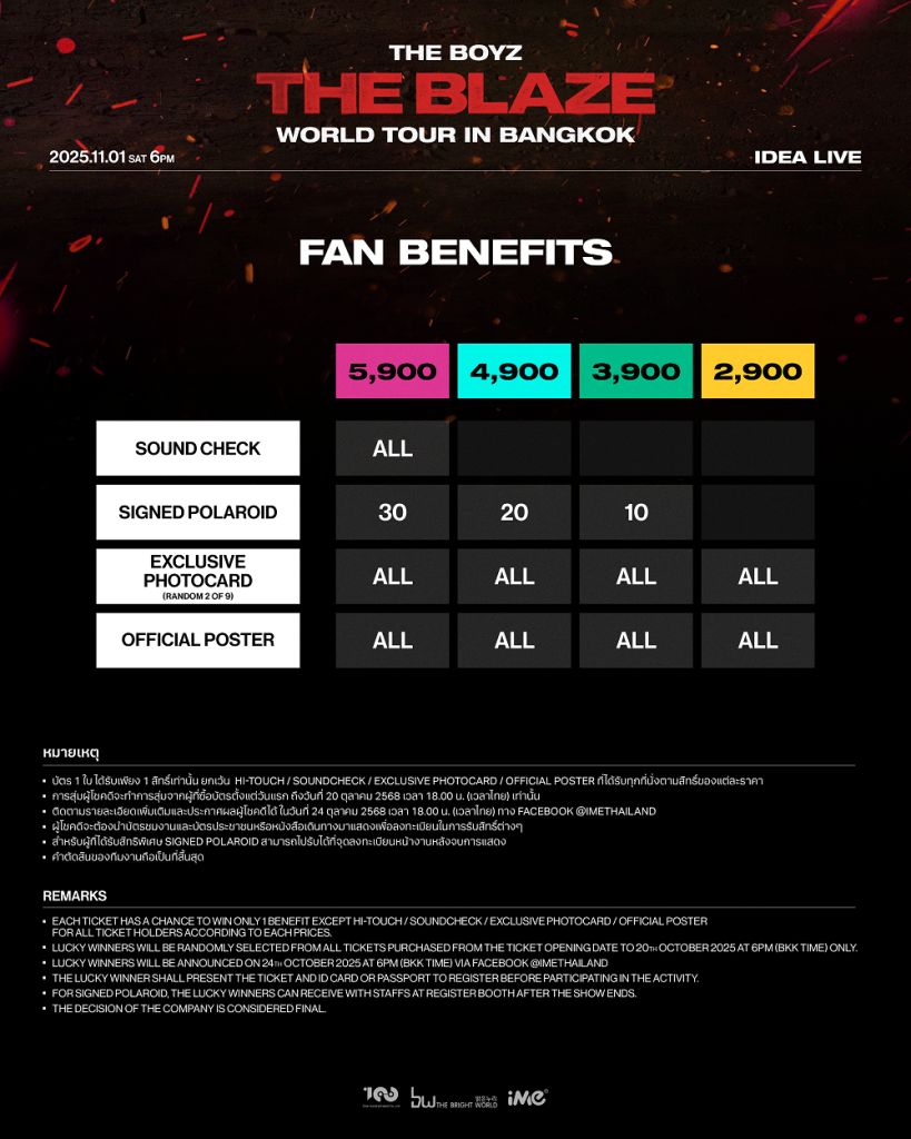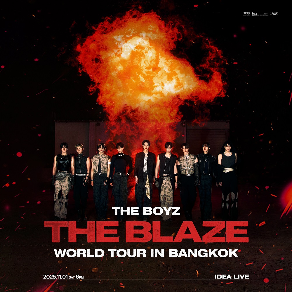 เตรียมเสียงกรี๊ดให้พร้อม! ความร้อนแรงระดับหัวใจวูบวาบกำลังจะลุกโชนอีกครั้ง เมื่อผู้จัด iMe Thailand เดินเกมไม่หยุด ปล่อยหมัดเด็ดประกาศคอนเสิร์ตรัวๆ และล่าสุดถึงคิวพาบอยแบนด์ตัวท็อปแห่งเค-ป็อปอย่าง THE BOYZ กลับมาปลุกทุกความคิดถึงของเหล่า THE B ชาวไทย (THE B : ชื่อแฟนคลับ) นำทีมโดย “เจคอบ (Jacob), ยองฮุน (Younghoon), ฮยอนแจ (Hyunjae), จูยอน (Juyeon), เควิน (Kevin), นิว (New), คิว (Q), ซอนอู (Sunwoo)” และ “เอริก (Eric)” หนุ่มๆ พร้อมเสิร์ฟความสนุกไฟลุกเวที ในงาน “THE BOYZ <THE BLAZE> WORLD TOUR in BANGKOK” วันเสาร์ที่ 1 พฤศจิกายน 2568 ณ IDEA LIVE, BRAVO BKK
