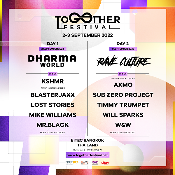 ประเดิมวันแรก 2 กันยายน กับ Stage Dharma Worldwide ที่มาเยือนประเทศไทย เป็นครั้งแรกที่งาน Together Festival ของเรา ทีม Dharma Worldwide มาพร้อมกองทัพดีเจระดับโลกมากมาย นำทีมโดย KSHMR , Blasterjaxx ดีเจชาว Dutch ขวัญใจคนไทยอีกหนึ่งคน ที่จะกลับมาสร้างความมันส์อีกครั้ง พร้อมกระโดดไปกับเพลงสไตล์ Big room ที่ชื่นชอบ , Mike Williams ดีเจ/โปรดิวเซอร์ชาวดัตช์ เขาเป็นที่รู้จักกันเป็นอย่างดีจากการร่วมงานกับ Tiësto และในฐานะศิลปินของ Spinnin’ Records เขาได้รับการยกย่องว่าเป็นหนึ่งในผู้บุกเบิกแนวเพลง future bounce พร้อมด้วย Mr. Black และ Løst Støries ต่อด้วยวันที่ 3 กันยายน กับ Stage “ RAVE CULTURE “ ที่มาพร้อมศิลปินระดับโลก นำทีมโดย SUBZERO PROJECT ดีเจสาย Hardstyle จากค่าย Rave Culture ที่ทั้งคู่ มีผลงานเพลงหลายเพลง ที่ทำให้แฟนๆชอบมากๆ อาทิ ‘The Solution’ ที่ได้ Villain มาร่วมด้วย และ ยังมีเพลง Rave Into Space ที่ปล่อยมา 2 ปีแล้ว แต่ก็ยังคงสุดยอด ทุกครั้งที่ได้ฟัง พวกเค้าพร้อมจัดเต็มความเดือดของ Hardstyle ที่จะเอาใจแฟนๆชาวไทยให้ได้กรี๊ดกันอย่างบ้าคลั่งไปเลย , TIMMY TRUMPET กลับมาครั้งนี้ แฟนๆ เตรียมกรี๊ดกันได้เลย พร้อมความสุดยอดของ SET ใหม่ที่จะมาพาทุกคนได้มันส์อย่างเต็มที่ และ AXMO ,WILL SPARKS , W&W