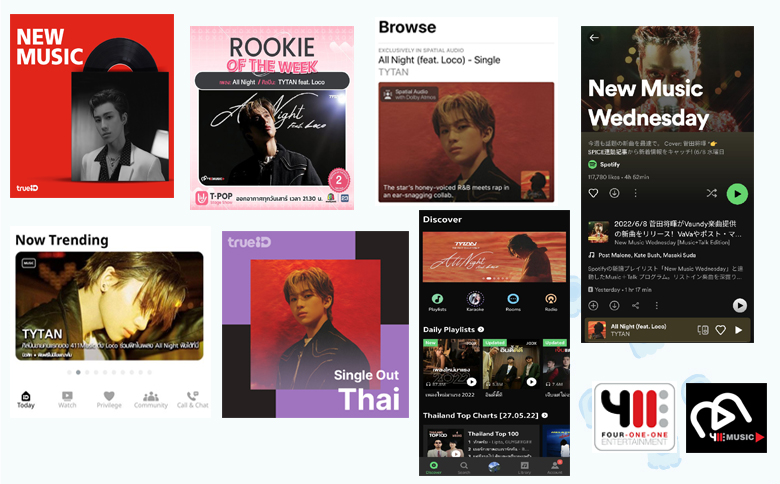 โอ้มายก๊อด! พึ่งปล่อยซิงเกิลเพลง All Night (feat. Loco) ของศิลปินหนุ่ม “TYTAN” (ไทแทน) หรือ “ไทแทน ทีปประสาน” จากค่าย 411 Music ไปเพียงสามสัปดาห์เพลงใหม่อย่าง All Night (feat. Loco) เพลงแนวอาร์แอนด์บี/ฮิปฮอปที่สื่อให้ทุกคนได้สัมผัสห้วงอารมณ์ความรู้สึกในค่ำคืนที่มีเสน่ห์และโรแมนติกก็มาแรงกระโดดไปเข้าไปเป็นลิสเพลงน้องใหม่สุดฮอตในแพลตฟอร์มสตรีมมิ่งต่างๆ อย่าง The New Asia จาก Apple Music / T-Pop Now จาก Spotify / New Music เพลงใหม่มาแรงจากTrueIDMusic/แบนเนอร์แนะนำเพลงใหม่จาก Joox Music รวมถึง #tytandebutshowcase จาก TikTok ยอดคนดูถึง 3.1 ล้านคนและการันตีความฮอตคว้ารางวัล Rookie Of The week ติดต่อกัน 2 สัปดาห์ จากรายการ T-pop Stage Show ให้ชื่นใจอีกด้วย