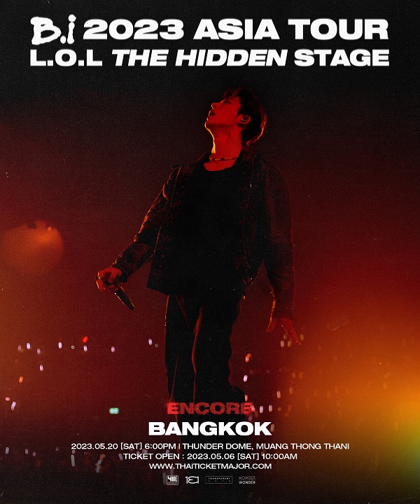 เปิดทัวร์ที่ไหน ก็ปิดทัวร์ที่นั่นกันไปเลย! งานนี้มงลงที่เหล่าไอดี (ID ชื่อเรียกแฟนคลับ) ชาวไทย เพราะ โฟร์ วัน วัน เอ็นเตอร์เทนเม้นท์ (Four One One Entertainment หรือ 411Ent) คอนเฟิร์มเรียบร้อยโรงเรียน กึ้ง–เฉลิมชัย มหากิจศิริ ว่า “บีไอ” (B.I) หรือ “คิมฮันบิน” (KIM HAN BIN) จะกลับมาอีกครั้งตามคำเรียกร้องในคอนเสิร์ต “บีไอ 2023 เอเชีย ทัวร์ [แอล.โอ.แอล เดอะ ฮิดเดน สเตจ] อังกอร์ อิน แบงคอก” (B.I 2023 ASIA TOUR [L.O.L THE HIDDEN STAGE] ENCORE IN BANGKOK) โดยความร่วมมือของต้นสังกัดเกาหลี วันทรีวัน (ONE THREE ONE หรือ 131) และ ทรานส์พาเรนท์ อาร์ตส (Transparent Arts) ประเทศสหรัฐอเมริกา ปักวันสุดทันใจ เสาร์ที่ 20 พฤษภาคม 2566 นี้ เวลา 18:00 น. ณ ธันเดอร์โดม เมืองทองธานี