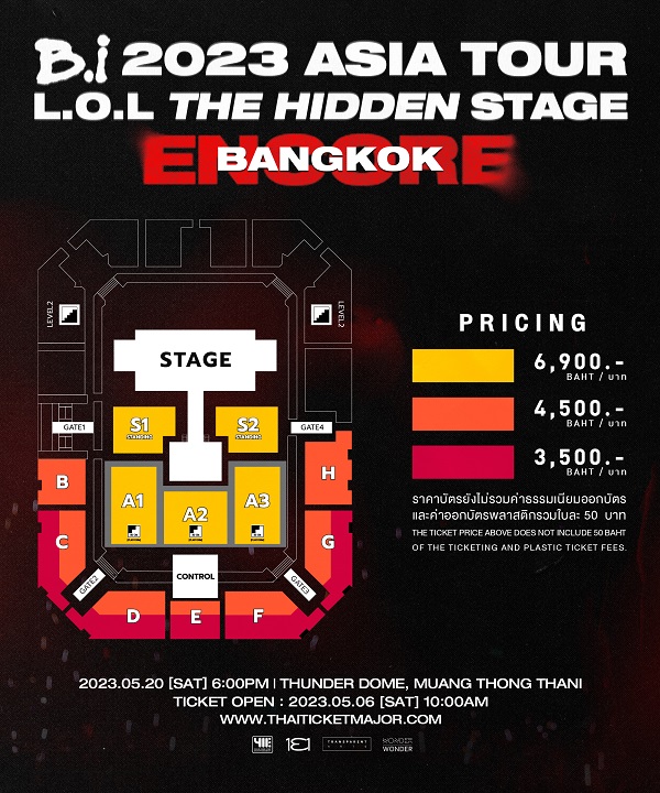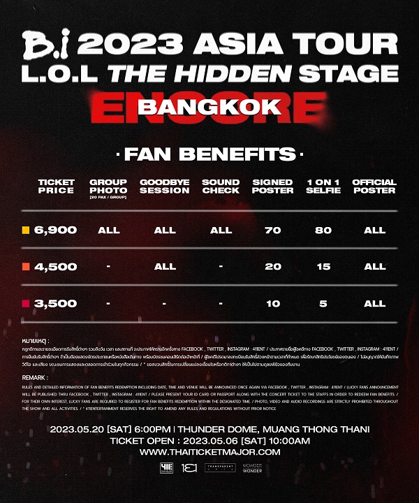 “บีไอ 2023 เอเชีย ทัวร์ [แอล.โอ.แอล เดอะ ฮิดเดน สเตจ] อังกอร์ อิน แบงคอก” #BI_LOLTheHiddenStage_ENCORE ได้ทางออฟฟิเชียลโซเชียลมีเดียของผู้จัดงาน @411ent