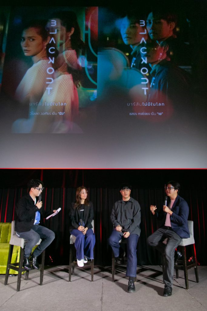 บรรยากาศภายในงานแถลงข่าวเต็มไปด้วยความคึกคัก  ทุกคนต่างตื่นเต้น เพราะเป็นครั้งแรก!! ที่ทุกคนจะได้ดูเทรลเลอร์ “BLACKOUT บาร์ลับไม่มีในโลก” ไปพร้อม ๆ กัน    เตรียมพบกับลูกเล่นการฉายที่ไม่เหมือนซีรีส์เรื่องใดในโลก กับการถ่ายทำแบบลองเทค ที่เหมือนได้เดินตามตัวละคร อย่างต่อเนื่อง ตลอด 20 นาที เห็นเหตุการณ์เดียวกันใน 4 มุมมองตลอด 4 ตอนแรก และยิ่งไปกว่านั้น ซีรีส์ยังถูกออกแบบมาให้คุณสามารถนำโทรศัพท์มือถือ 4 เครื่องมาเรียงต่อกันได้  เพื่อนำคนดูไปพบกับ ความรู้สึกใหม่ในการดูซีรีส์ที่คุณสามารถสนุกยิ่งขึ้นได้ ด้วยการดูร่วมกับเพื่อน หรือคนใกล้ชิด