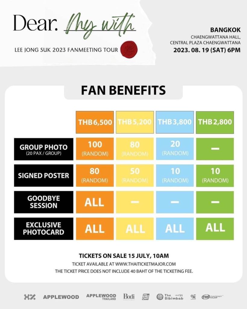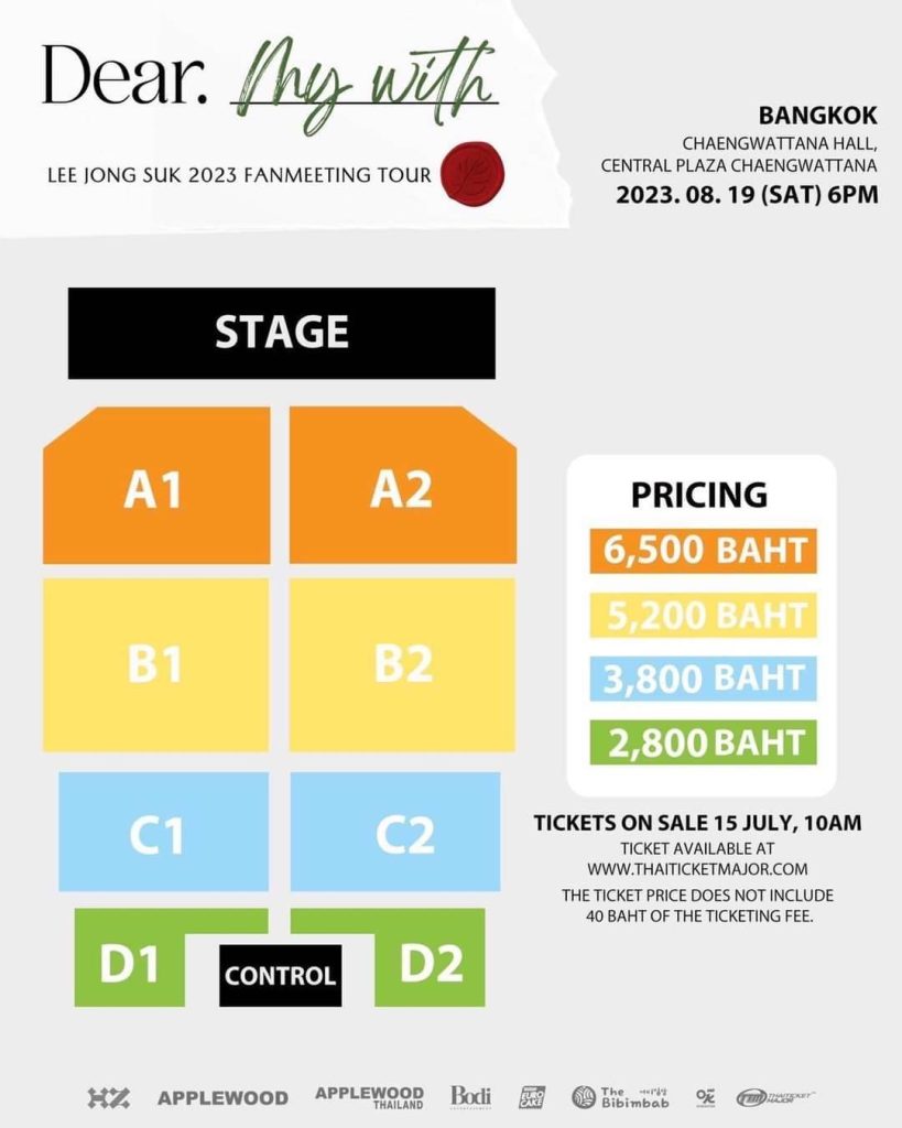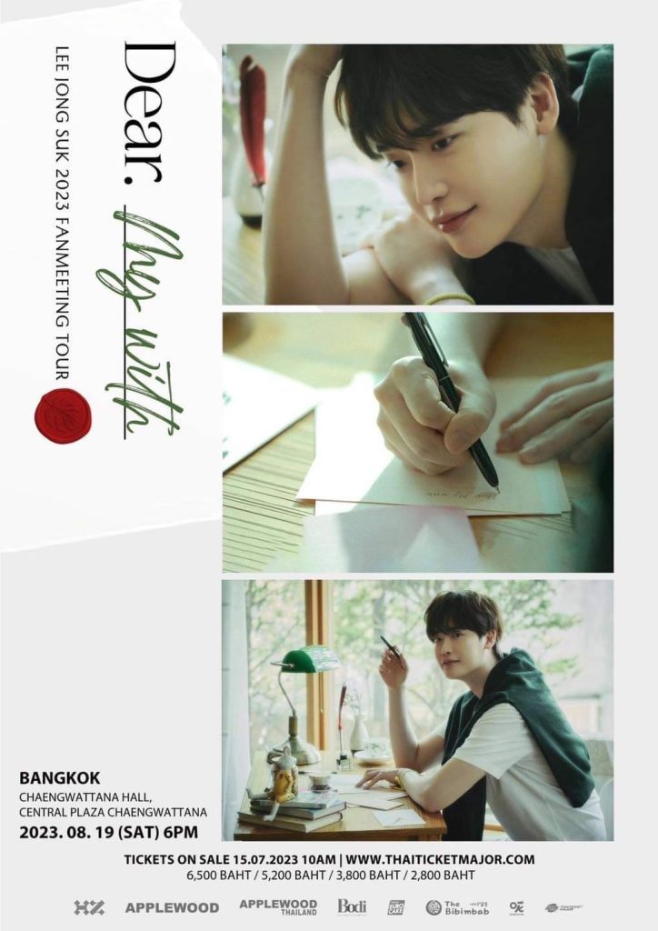ซึ่งงานนี้พระเอกอีจงซอกได้แอบกระซิบฝากบอกมายังแฟนๆ ชาวไทยที่กำลังรอคอยประกาศความพร้อมที่จะกลับมาสบตาและสร้างความทรงจำให้หายคิดถึงใน LEE JONG SUK 2023 FANMEETING TOUR <Dear. My With> ในวันเสาร์ ที่ 19 สิงหาคมนี้ 2566 เวลา 18 :00 น ที่ แจ้งวัฒนะ ฮอล์ ชั้น 5 ศูนย์การค้า เซ็นทรัลแจ้งวัฒนะ เริ่มเปิดจำหน่ายบัตรตั้งแต่วันที่ 15 กรกฎาคม 2566 เวลา 10 : 00 น ทาง https://www.thaiticketmajor.com/ บัตรราคา 6,500 /5,200/3,800/2,800 บาท