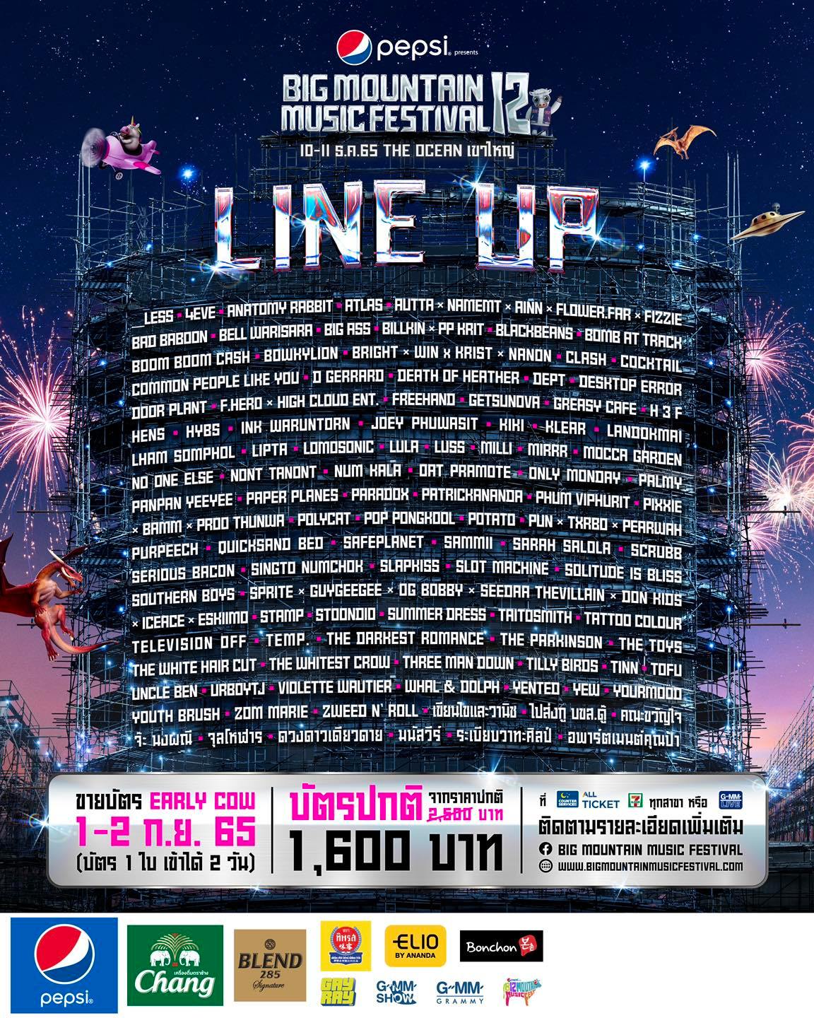 เตรียมตัวให้พร้อม และนับถอยหลังสู่เทศกาลดนตรีที่ยิ่งใหญ่ที่สุดในประเทศไทย ‘เป๊ปซี่ พรีเซนต์ บิ๊ก เมาน์เท่น มิวสิค เฟสติวัล ครั้งที่ 12 ALL-NEW BMMF 12 มัน-ใหม่-มาก’ พบกันวันที่ 10 – 11 ธันวาคม 2565 ณ ดิ โอ เชี่ยน เขาใหญ่ จ.นครราชสีมา พร้อมเปิดจำหน่ายบัตร Early Cow ในวันที่ 1 – 2 กันยายน 2565 (บัตร 1 ใบ เข้างานได้ 2 วัน) ราคา 1,600 บาท (จากราคาปกติ 2,500 บาท) ซื้อบัตรได้ที่เคาน์เตอร์เซอร์วิส ออลล์ ทิคเก็ต ในร้านเซเว่นอีเลฟเว่น ทุกสาขาทั่วประเทศ หรือ www.allticket.com สามารถติดตามรายละเอียดเพิ่มเติมที่ FB : Big Mountain Music Festival