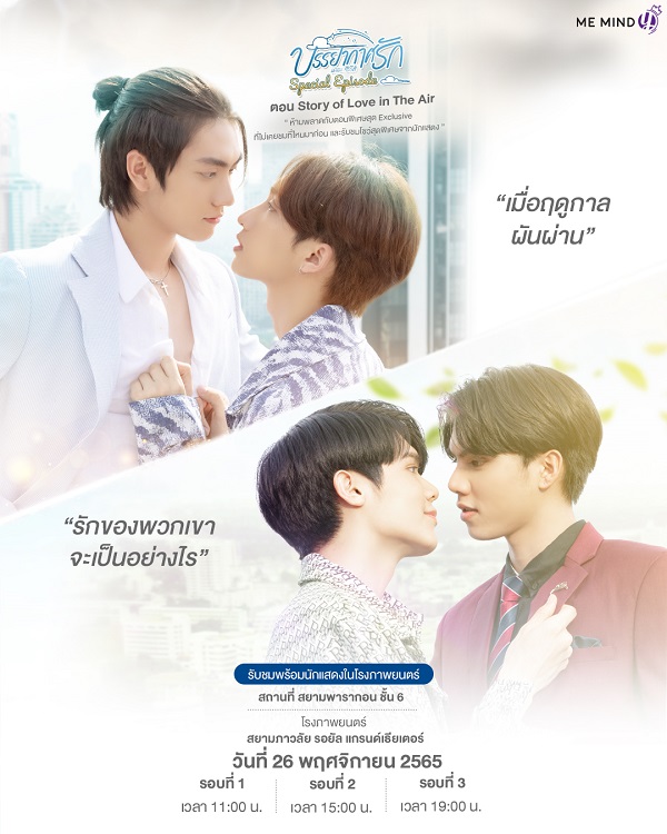 เรียกได้ว่าปังไม่หยุด!!! ทั้งในไทยและต่างประเทศ สำหรับ “บรรยากาศรัก เดอะซีรีส์ ” ( Love in The Air) เห็นได้ชัดจากบัตรรอบพิเศษ EP 8 ถูกจองจนหมดเกลี้ยงภายใน 3 นาทีที่เปิดขาย รวมถึงการขึ้นเทรนด์ทวิตเตอร์ทุกสัปดาห์ ในวันที่ซีรีส์ออกอากาศ และยังเป็นซีรีส์ติดอันดับยอดนิยมบนแพลตฟอร์ม iQIYI อย่างต่อเนื่อง ล่าสุดด้วยความยียวน ปนน่ารักน่าเอ็นดูของคู่ #พระพายสกาย ใน  EP 10  ทำให้บรรยากาศรัก เดอะซีรีส์ กลับมาติดอันดับที่ 4 ของเทรนด์โลกบนทวิตเตอร์อีกครั้ง งานนี้ คุณเมย์ – อรวรรณ วิชญวรรณกุล ในฐานะผู้จัด นักเขียน และผู้บริหาร บริษัท มี มายด์ วาย จำกัด เลยอยากมาแจ้งข่าวดีว่าได้เตรียมมอบความสุขสุดพิเศษให้กับแฟนซีรีส์กันอีกครั้ง แบบจัดเต็มความ Exclusive กับ งาน Special Episode ตอน Story of Love in The Air ในวันเสาร์ที่ 26 พฤศจิกายน 2565  สยามภาวลัย รอยัล แกรนด์เธียเตอร์ ชั้น 5 สยามพารากอน ซึ่งในงานนี้นอกจากแฟนซีรีส์จะได้เห็นบทสรุปความรักของทั้ง 2 คู่  4 ตัวละคร #พายุเรน และ #พระพายสกาย กันแล้ว 4 นักแสดงหนุ่มสุดฮอตอย่าง ฟอร์ด – ฐิติพงศ์ เซ่งง่าย , พีท – วสุธร ชัยจินดา , โนอึล – ณัฐรัชต์ ตังวาย และ บอส – ชัยกมล เสริมส่งวิทยะ ยังได้เตรียมโชว์สุดพิเศษที่ยังไม่เคยโชว์ที่ไหนมาก่อนเอาไว้มอบให้แฟน ๆ ภายในงานได้ฟินจิกหมอนกันอีกด้วย