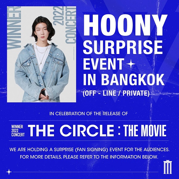 นอกจากนี้ ร่วมลุ้นร่วมงานแฟนมีตติ้งหนุ่ม อีซึงฮุน (Lee Seunghoon) ที่บินลัดฟ้ามาไทยกระทบไหล่กับเหล่าแฟนคลับชาวไทยอย่างใกล้ชิดในงาน “HOONY SURPRISE EVENT IN BANGKOK” ในวันเสาร์ที่ 1 เมษายน 2566 เวลา 18.00 น. ณ โรงภาพยนตร์วีไอพี 3 พารากอน ซีนีเพล็กซ์ เรียกได้ว่าเป็นโมเมนต์สำคัญที่อินซอชาวไทยไม่ควรพลาด!! เพียงซื้อบัตรชมภาพยนตร์ “WINNER 2022 Concert The Circle : The Movie” 1 ใบ/1 สิทธิ์ ก็มีสิทธิ์ลุ้นเป็น 1 ใน 44 ผู้โชคดีที่จะได้ไปร่วมกรี๊ดและรับลายเซ็นอย่างใกล้ชิด สามารถลงทะเบียนได้ที่ลิ้งค์ Google From https://bit.ly/MajorHoonyFanSign ประกาศรายชื่อผู้โชคดีในวันที่ 30 มีนาคม 2566 เวลา 18.00 น. ทาง FB และ Twitter Major Group