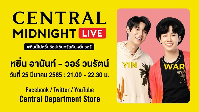 ด้วยความพร้อมของห้างเซ็นทรัลที่เป็นห้างแรกและห้างเดียวในไทยที่เชื่อมช่องทางออฟไลน์และออนไลน์เข้าไว้ด้วยกันเป็นแพลตฟอร์มออมนิชาแนลอย่างสมบูรณ์แบบ ในทุกๆ แคมเปญของห้างเซ็นทรัลจึงมีความแข็งแกร่งรอบด้าน สร้างการเติบโตในธุรกิจค้าปลีกด้วยการเพิ่มโอกาสใหม่ๆ ในทุกช่องทางการขาย ผสานทั้งด้านเทคโนโลยีและกลยุทธ์ทางการตลาดเข้าด้วยกัน เพื่อตอบโจทย์ความสะดวกสบายในทุกไลฟ์สไตล์ของลูกค้าแต่ละท่านให้ได้มากที่สุด รวมไปถึงการใช้ช่องทาง โซเชียลมีเดีย ดารา และอินฟลูเอ็นเซอร์ เพื่อสร้างการรับรู้ โปรโมตแคมเปญในวงกว้าง ซึ่งครั้งนี้ แฟนคลับ หยิ่น-อานันท์ และวอร์-วนรัตน์ ห้ามพลาด! ชมไลฟ์ความสนุก กับตอน #คืนนี้ไม่หวั่นช้อปเซ็นทรัลกับหยิ่นวอร์ ในวันที่ 25 มีนาคม 2565 เวลา 21.00 น. – 22.30 น. รับชมผ่านทาง YouTube, Facebook และ Twitter ของ CentralDepartmentStore และยังมีไฮไลต์พิเศษกับการเปิดตัวหนังโฆษณาตัวใหม่เป็นภาคต่อจากคอนเซ็ปต์ “GuiltyFreeFestival ช้อปเลยเพราะไม่เคยมี” สร้างสีสันและรอยยิ้มให้ทุกคนได้รู้สึกเอ็นจอยและเข้าถึงความสนุกในครั้งนี้ได้ที่ https://www.facebook.com/CentralDepartmentStore/