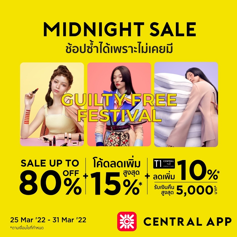 มาช้อปมันส์ ที่งาน Central Midnight Sale #GuiltyFreeFestival ช้อปเลยเพราะไม่เคยมี” #New Arrival ตั้งแต่วันที่ 25 มีนาคม – 5 เมษายน 2565 ที่ห้างเซ็นทรัลทุกสาขา และทุกช่องทางการช้อปปิ้งของทางห้างฯ พร้อมแฮชแท็กร่วมสนุกกันได้ที่ #CentralMidnightSale #GuiltyFreeFestival #CentralDepartmentStore