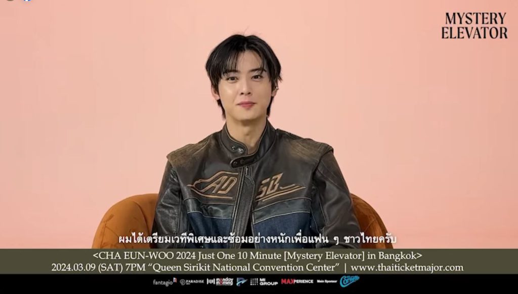 งานนี้หนุ่มชาอึนอู ก็ไม่ลืมส่งคลิปอ้อนแฟน ๆ ชาวไทยมาให้ใจละลาย และฟินกันก่อน “สวัสดีครับ ชาอึนอูครับ ในวันที่ 9 มีนาคม 2024 ณ ศูนย์การประชุมแห่งชาติสิริกิต์ Exhibition Hall 3-4 2024 Just One 10 Minute [Mystery Elevator] in Bangkok ผมรู้สึกดีใจมาก ๆ ที่จะได้พบกับแฟน ๆ ชาวไทยอีกครั้ง ในงานแฟนคอนเสิร์ตของผมครั้งนี้ครับ ผมเตรียมเวทีพิเศษและซ้อมอย่างหนักเพื่อแฟน ๆ ชาวไทยครับ ผมอยากให้ทุกคนรักษาสุขภาพแล้วมาสนุกด้วยกันนะครับ “คิดถึงมาก ๆ รักทุกคนครับ ผมจะเป็นชาที่ดี คือชาอึนอูของทุกคนครับ ขอบคุณครับ”