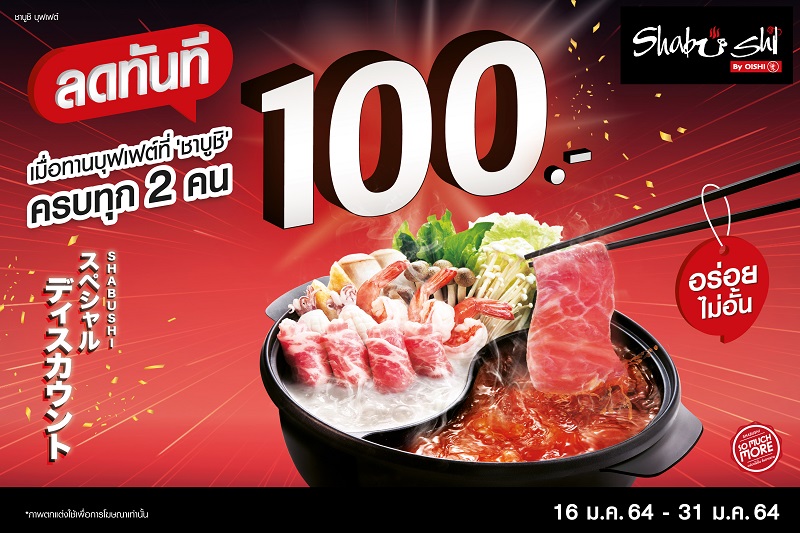พิเศษเฉพาะช่วงนี้ รับส่วนลดทันทีถึง 100 บาท เมื่อมาใช้บริการและรับประทานบุฟเฟต์ ชาบูชิ ครบทุก 2 คน (เฉพาะราคาผู้ใหญ่ปกติ) โดยสามารถรับสิทธิ์ง่าย ๆ ผ่านแอปพลิเคชัน BevFood ด่วน !!! ตั้งแต่ 16 – 31 มกราคม 2564 เท่านั้น สอบถามเงื่อนไขและข้อมูลเพิ่มเติม คลิกแฟนเพจโออิชิฟู้ดสเตชั่น : www.facebook.com/OishiFoodStation หรือค้นหาชาบูชิสาขาใกล้ ๆ คุณ คลิกโออิชิฟู้ดดอทคอม : www.oishifood.com
