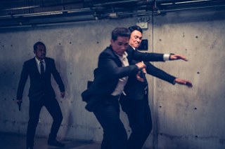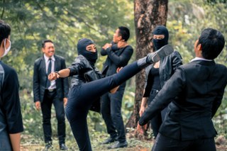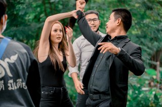 ถือว่าเป็นฉากใหญ่อีกฉากที่นักแสดงค่อนข้างเยอะ แล้วเป็นการบู๊ต่อเนื่องที่ค่อนข้างยาว ทำให้ ทีมงานต้องมีการซักซ้อมคิวบู๊กันอย่างละเอียดเพื่อความปลอดภัยของทุกคนในการถ่ายทำ และใช้เวลาในการถ่ายทำค่อนข้างนานเลยทีเดียว เรียกว่าทุ่มเทกันสุดตัว เริ่มตั้งแต่ฉากปะทะกันที่ห้องใต้ดินของ ต้น อ่ำ ขวัญ และ นุ้ย ทุกคนก็เตะต่อยกันได้อย่างคล่องแคล่วดุเดือดสมจริงมากแบบไม่แคร์พื้นที่แคบเลยทีเดียวแล้วไปต่อกันที่ฉากขวัญต้องปะทะคารมกับต่ายเพื่อชิงเพชร จนเกิดการปะทะกันชุลมุนวุ่นวาย แล้วขวัญก็ฉวยโอกาสรวบตัวโอมไว้เป็นตัวประกันพร้อมชิงเพชรหนีไป ซึ่งพอผู้กำกับสั่งคัทก็เล่นเอานักแสดงทุกคนหอบแฮกๆ รีบขอน้ำแดงทีมงานเพื่อเติมน้ำตาลเรียกพลังเป็นการด่วนเลยทันที