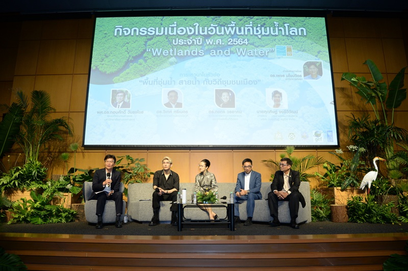 การเสวนาในหัวข้อ “พื้นที่ชุ่มน้ำ สายน้ำ กับวิถีชุมชนเมือง” จากผู้มีความรู้และประสบการทำงานด้านพื้นที่ชุ่มน้ำ ประกอบด้วย ผศ.ดร.กอบศักดิ์ วันธงไชย คณบดีคณะวนศาสตร์ มหาวิทยาลัยเกษตรศาสตร์ ดร.วิเทศ ศรีเนตร ผู้เชี่ยวชาญด้านระบบนิเวศและการมีส่วนร่วม ดร.กชกร วรอาคม ผู้เชี่ยวชาญด้านการออกแบบและวางผังพื้นที่สีเขียว นายศุภศิษฏ์ จงชีวีวัฒน์ นักแสดงและประธานกรรมการบริหาร บริษัท มิวศุภศิษฏ์ สตูดิโอ จำกัด และ ดร.เพชร มโนปวิตร นักวิชาการอิสระ รวมทั้งนำเสนอสื่อคุณค่าและความสำคัญของพื้นที่ชุ่มน้ำกับวิถีชีวิตชุมชน