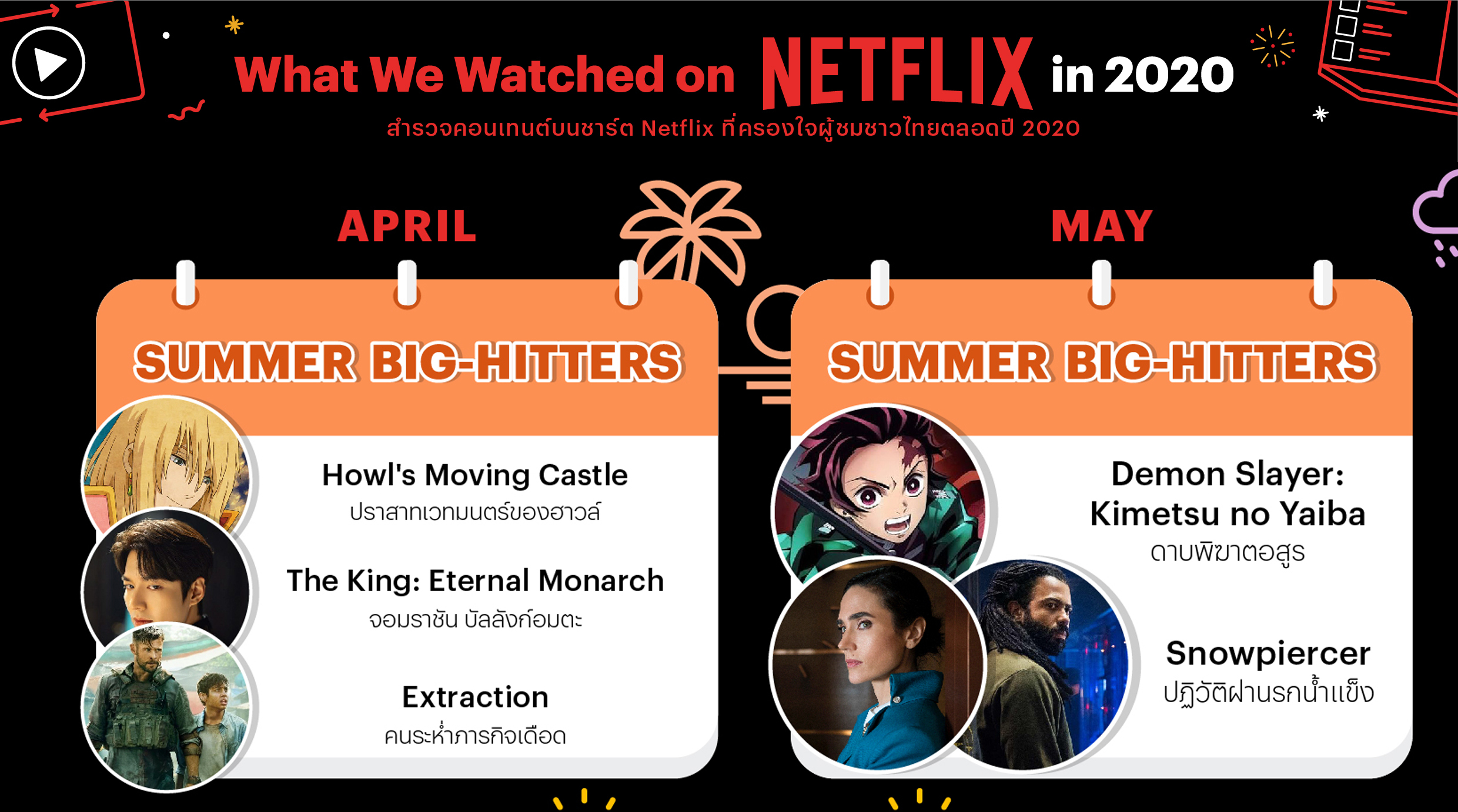 ปกติแล้ว ถ้าพูดถึงหน้าร้อน เราก็คงนึกถึงแดดเปรี้ยง ๆ กับวันหยุดยาวที่ทุกคนแห่กันหนีเมืองไปนอนริมหาด หรือไม่ก็กระแสความตื่นตาตื่นใจกับหนังฟอร์มยักษ์มากมายที่เปิดฉายกันรัวแบบไม่มีเว้นแม้แต่สัปดาห์เดียว ถึงปีนี้เราจะต้องอยู่ติดบ้านกันหมด แต่เน็ตฟลิกซ์ก็ไม่ทำให้ผิดหวัง ขนทั้งหนังและซีรีส์ที่ชนะใจคนดูได้แบบครบทุกแนว ทุกอารมณ์ เริ่มกันจากเดือนเมษายน ที่เปิดฉากด้วย Howl’s Moving Castle (ปราสาทเวทมนตร์ของฮาวล์) หนึ่งในผลงานแอนิเมชันเหนือจินตนาการที่นำทัพภาพยนตร์จากสตูดิโอ จิบลิ เข้าป้ายเป็นภาพยนตร์อนิเมะที่มีผู้ชมสูงสุดของปี ก่อนจะไปแรงกันต่อด้วยเรื่องราวความรักข้ามมิติใน The King: Eternal Monarch (จอมราชัน บัลลังก์อมตะ) ที่ได้พระเอกตลอดกาลอย่างอีมินโฮมาเป็นแม่เหล็กใหญ่ ดูดคนดูติดจอจนทำผลงานติดท็อป 10 ได้ยาวนานที่สุดเป็นอันดับ 2 ของปี แถมยังเข้าป้ายซีรีส์เกาหลีที่มีผู้ชมสูงสุดอันดับ 2 รองจาก Kingdom เพียงเรื่องเดียวเท่านั้น