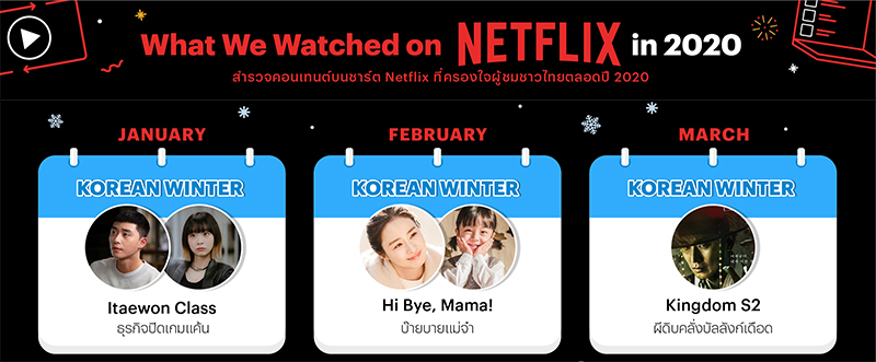 แน่นอนว่าตลอดปีนี้ ซีรีส์เกาหลีมากมายต่างผลัดกันขึ้นมายึดหัวตารางในท็อป 10 ของเรากันแทบจะทั้งปี โดยคอซีรีส์สายเกาในปีนี้ใช้เวลาหน้าจอกันมากกว่าปีที่แล้วถึง 3 เท่าตัว จึงไม่น่าแปลกใจที่เราเริ่มต้นปี 2020 กันด้วยการกระหน่ำ 3 ซีรีส์เกาหลีสุดฮิตต่อกันไปยาว ๆ ตลอดหน้าหนาว (ที่ไม่หนาว) ของบ้านเรา ไม่ว่าจะเป็นการต่อสู้บนเส้นทางธุรกิจสุดเข้มข้นของ Itaewon Class (ธุรกิจปิดเกมแค้น) ที่เปิดฉายตอนแรกช่วงสิ้นเดือนมกราคม ก่อนจะยืนหยัดในท็อป 10 ได้ต่อเนื่องยาวนานที่สุดเป็นอันดับ 3 ของปีนี้ ตามมาติด ๆ ด้วย Hi Bye, Mama! (บ๊ายบายแม่จ๋า) เรื่องราวความรักกลิ่นแฟนตาซีของแม่ผู้กลับมามีชีวิตอีกครั้งกับครอบครัว ในเดือนกุมภาพันธ์ ก่อนจะระเบิดฟอร์มเต็มที่กับซีซั่นสองของ Kingdom (ผีดิบคลั่ง บัลลังก์เดือด) ที่สร้างปรากฎการณ์ได้ยิ่งใหญ่ไม่แพ้ซีซั่นแรก ชวนแฟน ๆ ทั่วไทยมาร่วมโกยอ้าวหนีซอมบี้กับองค์รัชทายาทแห่งโชซอนได้อย่างล้นหลามในเดือนมีนาคม จนกลายเป็นซีรีส์เกาหลีที่มีผู้ชมสูงสุดของปี 2020 ไปในที่สุด