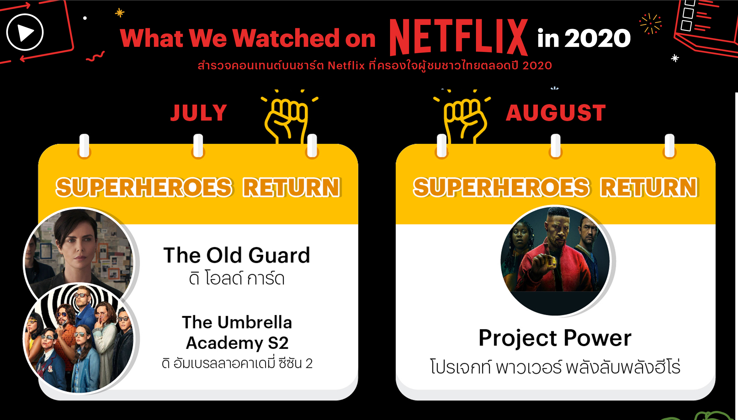 เมื่อชีวิตล็อกดาวน์สิ้นสุดลง ผู้คนออกมาใช้ชีวิตนอกบ้านกันคึกคักขึ้น ชาวเน็ตฟลิกซ์ก็เริ่มมองหาสีสันและความตื่นเต้นกันอีกครั้ง เราเลยต้องมีทัพซูเปอร์ฮีโร่ทั้งหน้าใหม่และหน้าเก่าออกมาแสดงพลังกันครบทีม นับตั้งแต่ทีมทหารรับจ้างอมตะของชาร์ลิซ เธอรอน กับภารกิจปกป้องโลกมนุษย์ใน The Old Guard (ดิ โอลด์ การ์ด) ที่ทะลุทะลวงขึ้นมาเป็นหนังแอ็คชั่นที่มีผู้ชมมากเป็นอันดับ 2 ของปีนี้ ไปจนถึงอีกหนึ่งภาพยนตร์ออริจินัลฟอร์มยักษ์อย่าง Project Power (โปรเจคท์ พาวเวอร์ พลังลับพลังฮีโร่) เกี่ยวกับยาเม็ดลึกลับที่ใครกินเข้าไปแล้วจะมีพลังซูเปอร์ฮีโร่ชั่วคราว โดยแทรกระหว่างกลางด้วยซีซั่น 2 ของ The Umbrella Academy (ดิ อัมเบรลลา อคาเดมี่) ซีรีส์ออริจินัลจากเน็ตฟลิกซ์ ที่เล่าเรื่องราววุ่น ๆ ของครอบครัวซูเปอร์ฮีโร่บ้านแตกกับภารกิจข้ามเวลากู้โลกในสไตล์ย้อนยุคสุดเก๋
