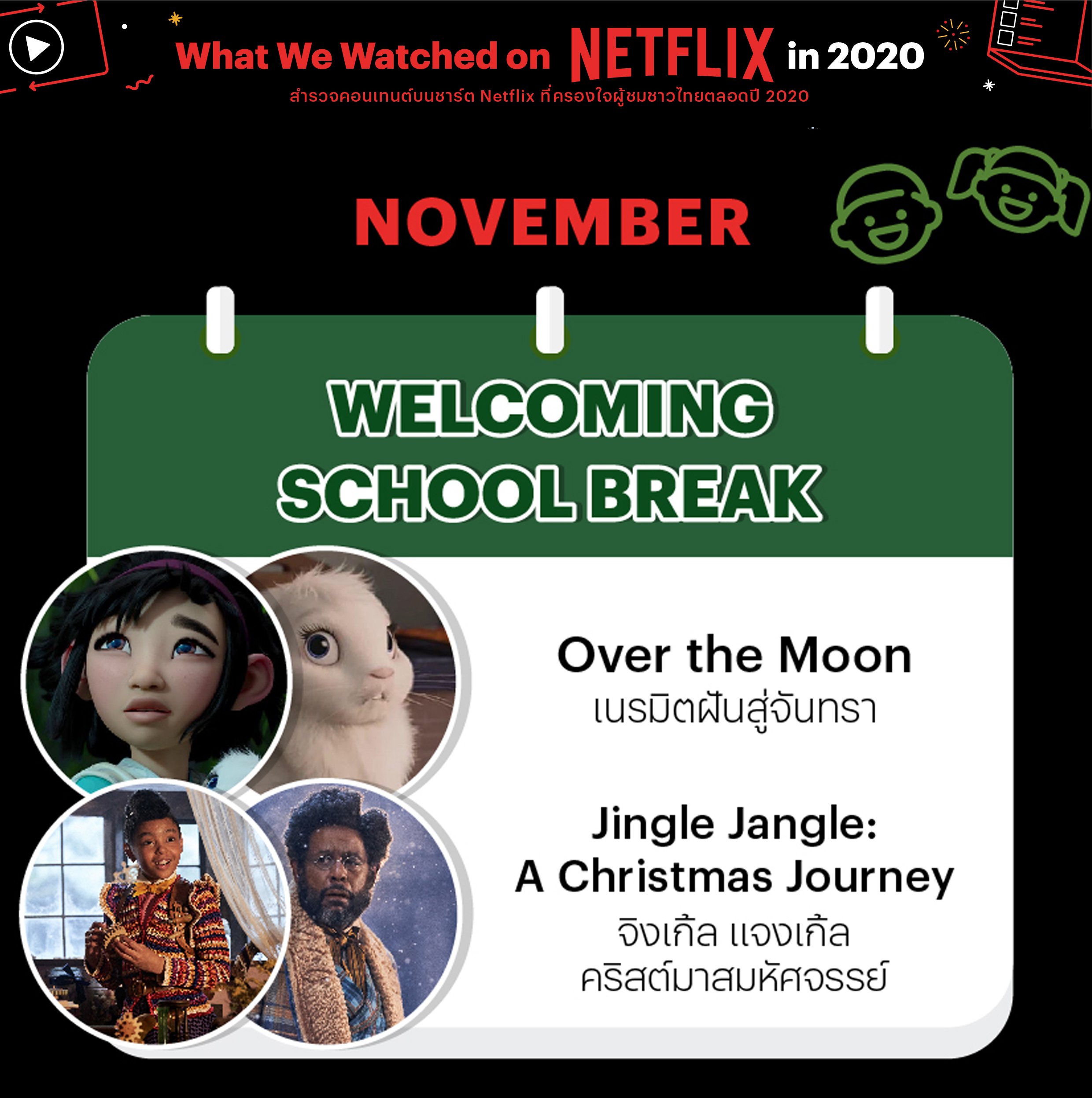 เข้าสู่บรรยากาศอันสดใส กระชุ่มกระชวยของช่วงท้ายปี เมื่อหลายคนต้องหยิบหนังเกี่ยวกับวันหยุดคริสต์มาสในวัยเด็กออกมาดูอีกครั้ง แต่กับเน็ตฟลิกซ์ เรายังมีสีสันใหม่ ๆ มาเสิร์ฟแบบต่อเนื่อง อย่างความน่ารักของ Over the Moon (เนรมิตฝันสู่จันทรา) ภาพยนตร์สำหรับเด็กอันดับ 1 ของปี ที่ฟุ้งไปด้วยกลิ่นอายของวัฒนธรรมแบบเอเชีย กับการถ่ายทอดตำนานของเทศกาลไหว้พระจันทร์อย่างงดงามผ่านเรื่องราวของเฟยเฟย เด็กผู้หญิงที่เดินทางไปยังดวงจันทร์พร้อมน้องกระต่ายคู่ใจ เพื่อตามหาเทพีบนดวงจันทร์ที่แม่ของเธอชอบเล่าให้ฟัง หรือจะเป็นบรรยากาศคริสต์มาสเต็มตัวใน Jingle Jangle: A Christmas Journey (จิงเกิ้ล แจงเกิ้ล คริสต์มาสมหัศจรรย์) ที่เติมกลิ่นอายความแฟนตาซีให้วันหยุดช่วงปิดเทอมได้อย่างลงตัว จนเข้าป้ายตามมาเป็นอันดับ 2 ในหมวดภาพยนตร์สำหรับเด็ก