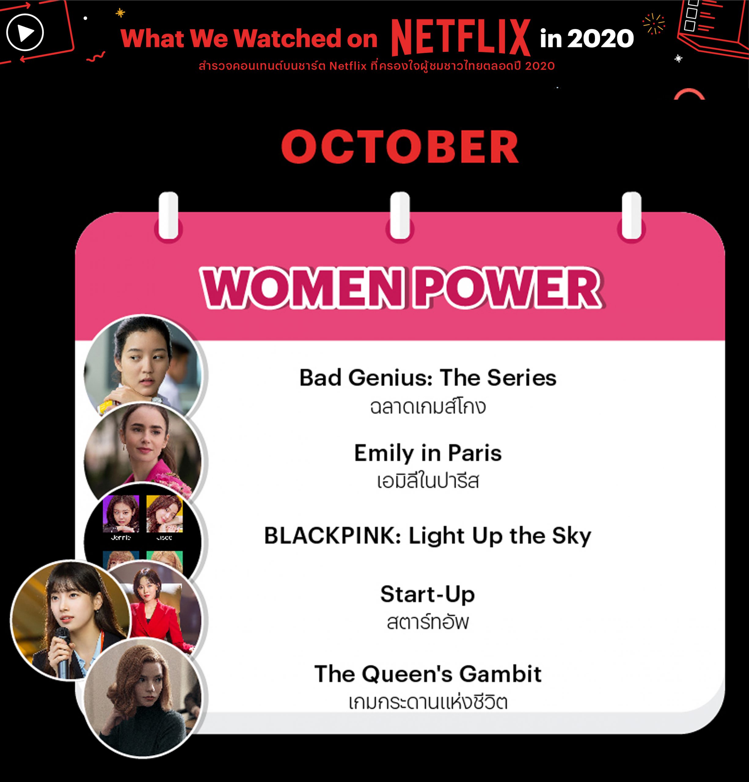 เมื่อเข้าสู่ช่วงปลายปี ก็ปรากฎว่าหัวแถวในชาร์ทของเน็ตฟลิกซ์เต็มไปด้วยหญิงแกร่งมากมายจากหนัง-ซีรีส์สารพัดแนว ไม่ว่าจะเป็น ลิน นักเรียนอัจฉริยะกับลูกเล่นสีเทาในโลกการศึกษาจาก Bad Genius: The Series ฉลาดเกมส์โกง ซึ่งขึ้นแท่นเป็นซีรีส์แนวทริลเลอร์อันดับ 3 ของปีนี้ สาวสายแฟชั่น เอมิลี่ กับความป่วนแบบเริ่ด ๆ และงานในฝันที่ปารีส ใน Emily in Paris (เอมิลี่ในปารีส) ซีรีส์คอมเมดี้อันดับหนึ่งแห่งปีของไทย หรือเบธ ฮาร์มอน เซียนหมากรุกหญิงกับเส้นทางการเป็นมืออาชีพในแวดวงหมากรุกที่ดูเหมือนจะผูกขาดไว้แค่สำหรับผู้ชาย จาก The Queen’s Gambit (เกมกระดานแห่งชีวิต) ที่ขึ้นแท่นเป็นซีรีส์แนวดราม่าอันดับหนึ่งในไทย และยังปลุกกระแสหมากรุกให้กลับมาฮิตไปทั่วโลกอีกด้วย