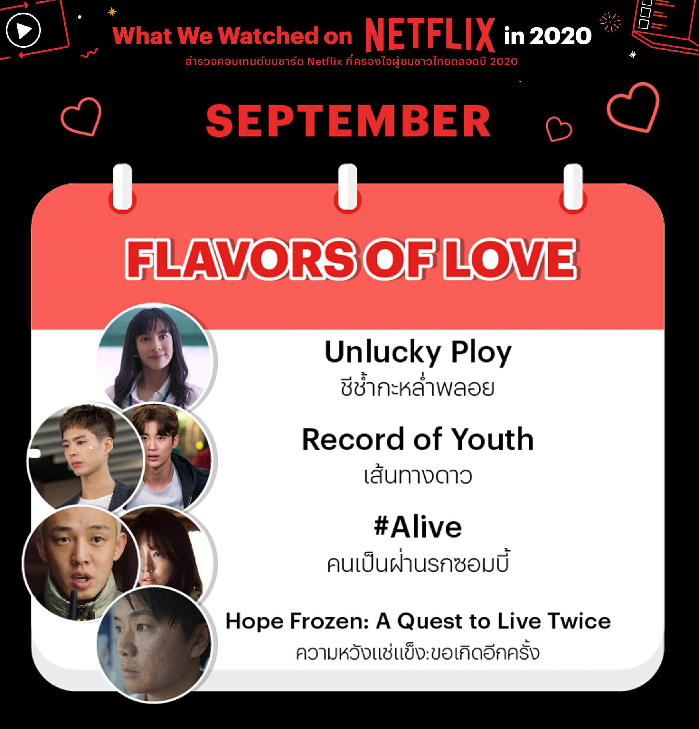 สำหรับเดือนกันยายน คอนเทนต์ที่ติดท็อปชาร์ทเต็มไปด้วยเรื่องราวความรักในหลายแง่มุม มีทั้งความชุลมุนของสองสาว ‘พลอยซวย’ กับ ‘พลอยสวย’ ใน Unlucky Ploy ชีช้ำกะหล่ำพลอย ซีรีส์ไทยที่ติดท็อป 10 ยาวนานที่สุดของปีนี้ ซึ่งมาออกอากาศตอนสุดท้ายในเดือนนี้พอดี ต่อด้วยซีรีส์เกาหลีฟินจิกหมอนกับความรักในวงการแฟชั่น Record of Youth (เส้นทางดาว) ก่อนจะสลับฉากไปสัมผัสเรื่องจริงที่เปี่ยมด้วยความรักอันยิ่งใหญ่ของพ่อแม่ใน Hope Frozen: A Quest to Live Twice (ความหวังแช่แข็ง ขอเกิดอีกครั้ง) สารคดีไทยอันดับหนึ่งแห่งปีบนเน็ตฟลิกซ์