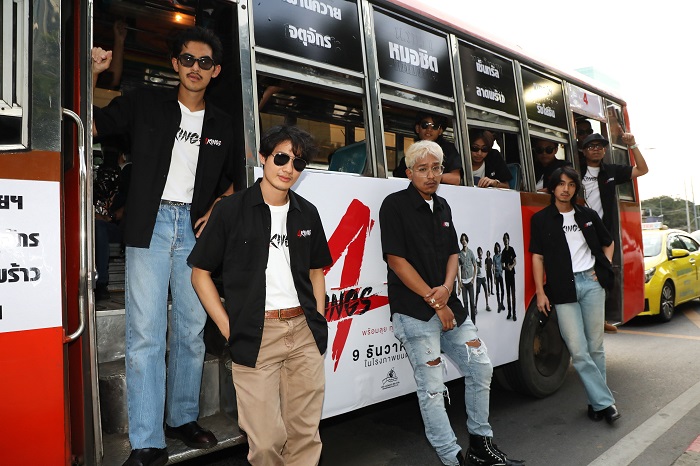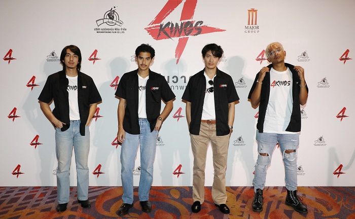 วันศุกร์ที่ 12 พฤศจิกายน 2564 : เป้ อารักษ์ ยกพวกแถลงข่าว ณ.เมเจอร์รัชโยธิน โหนรถเมล์เข้าร่วมงาน พร้อมพวกและอริตั้งโต๊ะแถลงข่าว ร่วมด้วย ณัฏฐ์ กิจจริต,ภูมิ รังษีธนานนท์,อุกฤษ วิลลีย์ บรอด ดอนกาเบรียล และ ผู้กำกับเลือดอาชีวะตัวจริง พุฒิพงษ์ นาคทอง กับฝีการกำกับภาพยนตร์เรื่องแรก บรรยากาศงานแถลงข่าวในจัดขึ้นภายในโรงภาพยนตร์ที่ 14 โดยเริ่มบรรยากาศงานด้วยการไลฟ์สดนักแสดงจากบนรถเมล์สาย 4 เข้าร่วมงานถ่ายทอดสดให้สื่อมวลชนได้เห็นถึงบรรยากาศตลอดจนถึงเวที โดยงานนี้ได้พิธีกรดำเนินรายการ คือ “เต๋า” สมชาย เข็มกลัด รับหน้าที่สัมภาษณ์พูดคุยกับนักแสดงและผู้กำกับ “พุฒิ” ผู้กำกับ ภาพยนตร์เรื่อง 4KINGS เล่าว่า ใช้เวลา 7 ปีในการพัฒนาบทจากหนังสั้นกลายมาเป็นภาพยนตร์ โดยต้องไปคุยกับสมาคมศิษย์เก่าอาชีวะของทั้ง 4 สถาบันเพื่อขออนุญาต ในการใช้ชื่อมาสร้างภาพยนตร์ การหานักแสดงและการหานายทุนโดยได้ค่ายหนัง เนรมิตหนังฟิล์ม เป็นผู้สร้างภาพยนตร์เรื่องนี้
