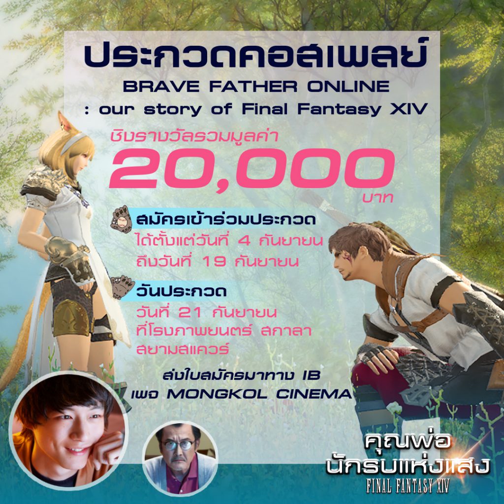 MONGKOL CINEMA ขอเชิญผู้สนใจสมัครเข้าร่วมประกวดคอสเพลย์ในงาน FAN DAY ของภาพยนตร์เรื่อง BRAVE FATHER ONLINE : our story of Final Fantasy XIV ประกวดคอสเพลย์จากเกม Final Fantasy XIV ชิงเงินรางวัลรวมมูลค่า 20,000 บาท