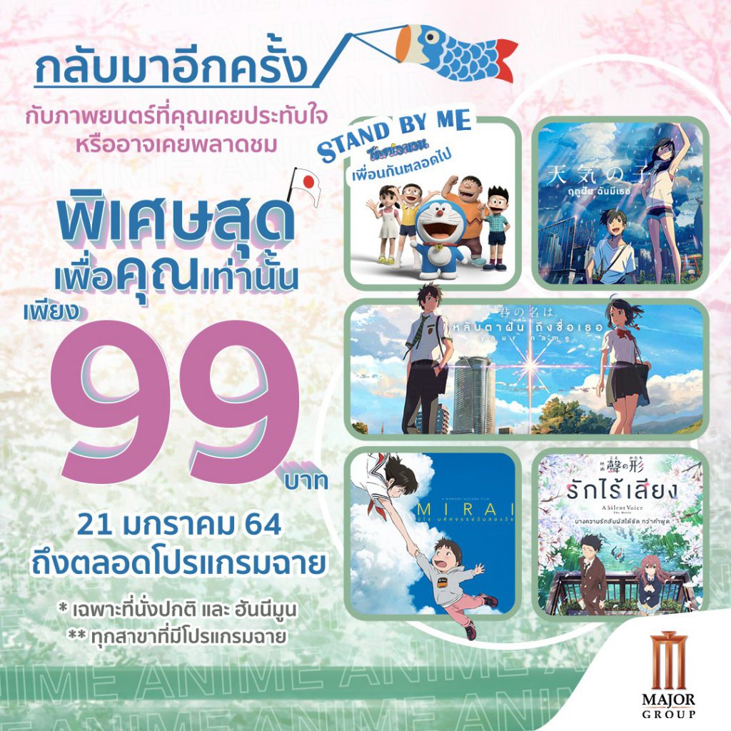 นอกจากนี้ ได้ร่วมกับ เอ็ม พิคเจอร์ส ตอบรับกระแสภาพยนตร์อนิเมะญี่ปุ่น Demon Slayer ดาบพิฆาตอสูร เดอะมูฟวี่ : ศึกรถไฟสู่นิรันดร์” ที่กลายเป็นภาพยนตร์อนิเมะที่ทำรายได้สูงสุดในประวัติศาสตร์ญี่ปุ่น จนเกิดเป็นกระแสความนิยมถูกพูดถึงเป็นอย่างมาก  ซึ่งครั้งนี้จะนำภาพยนตร์อนิเมะ 5 เรื่องดัง อาทิ Doraemon : Stand​ by​ Me, Mirai, Weathering with You, Your Name และ A Silent Voice สุดยอดแอนิเมชั่นญี่ปุ่นที่เคยครองใจผู้ชมมาแล้วทั่วประเทศ กลับมาฉายให้แฟนๆ ได้ชมกันอีกครั้ง ในราคาเพียงเรื่องละ 99 บาท สำหรับที่นั่งปกติ หรือ ที่นั่งฮันนีมูน ในระบบปกติ เข้าฉายวันที่ 21 มกราคมนี้ ซื้อบัตรได้ที่ จุดจำหน่ายบัตรชมภาพยนตร์, ตู้จำหน่ายตั๋วอัตโนมัติ E-Ticket และ Major Cineplex Application เฉพาะโรงภาพยนตร์ในเครือเมเจอร์ ซีนีเพล็กซ์ กรุ้ปเท่านั้น