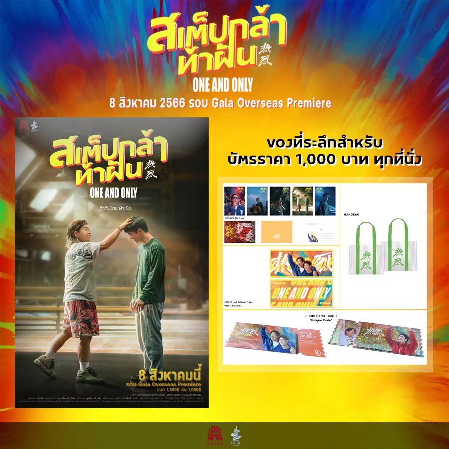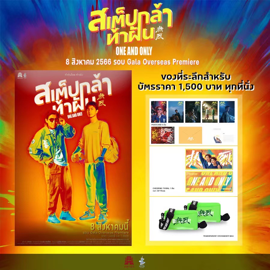 เอาใจแฟนหนังจีน “สเต็ปกล้า..ท้าฝัน One and Only” นำแสดงโดย “หวงป๋อ” และ “หวังอี้ป๋อ” ที่ได้แถลงข่าวรอบพิเศษที่ประเทศจีน ไปเมื่อวันก่อน บริษัท อาร์ท้อป มีเดีย (ไทยแลนด์) จำกัด สั่งลุย!! เปิดจองตั๋วหนังรอบพิเศษดูก่อนใคร โดยสามารถลงทะเบียนจองสิทธิ์ในการกดซื้อตั๋ววันนี้ทาง www.ARTOPMEDIATHAILAND.com เพื่อรับสิทธิ์ในการซื้อบัตรอย่างเป็นทางการในวันอาทิตย์ที่ 23 กรกฎาคม พ.ศ.2566 เปิดจำหน่ายเวลา 10.18น. เป็นต้นไป บัตรราคา 1,500 และ 1,000 บาท พร้อมรับของที่ระลึกจากหนังจำนวนจำกัด หมดแล้วหมดเลย