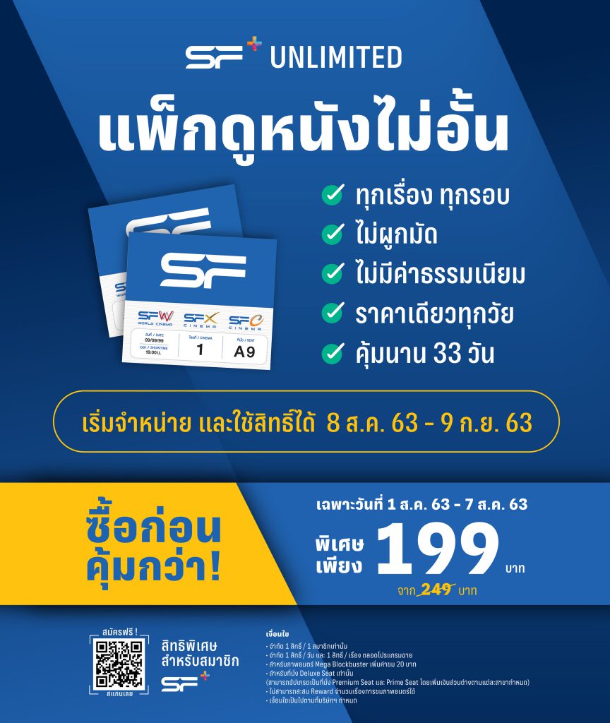 โรงภาพยนตร์ในเครือ เอส เอฟ อยากให้ทุกคนกลับมามีความสุขในการชมภาพยนตร์ จัดโปรแรง “SF+ UNLIMITED (เอส เอฟ พลัส อันลิมิเต็ด)” แพ็กเกจสุดคุ้ม รับสิทธิ์ดูหนังไม่จำกัดระหว่างวันที่ 8 สิงหาคม – 9 กันยายน 2563 (จำกัด 1 สิทธิ์/วัน/เรื่องตลอดโปรแกรมฉาย) ในราคา 249 บาท พิเศษสุดสำหรับลูกค้าที่สมัครแพ็กเกจล่วงหน้าภายในวันที่ 1-7 สิงหาคม 2563 สามารถซื้อได้ในราคาเพียง 199 บาทเท่านั้น! โดยสามารถสมัครผ่านช่องทางออนไลน์แอปพลิเคชั่น SF Cinema, เว็บไซต์ www.sfcinemacity.com หรือที่โรงภาพยนตร์ในเครือ เอส เอฟ ทุกสาขาทั่วประเทศ