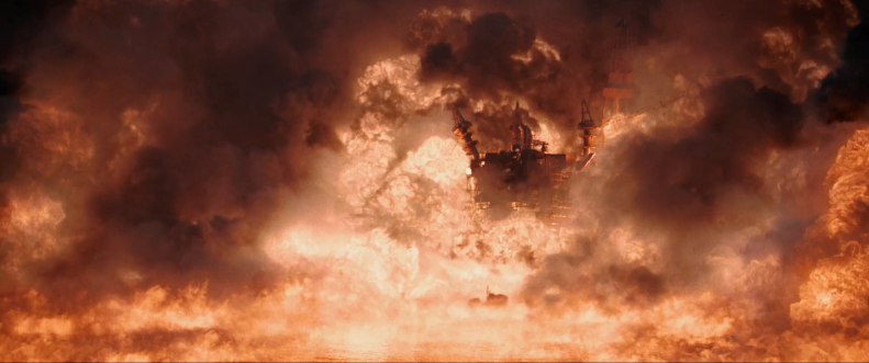 “เปลวเพลิงเผาวอดแตะท้องฟ้า” จากแรงระเบิดครั้งแล้วครั้งเล่าของแท่นขุดเจาะน้ำมันที่เต็มไปด้วยน้ำมันจำนวนมหาศาล เกิดเป็นเปลวไฟที่ลุกท่วมรุนแรงแตะท้องฟ้าจากการเผาไหม้ของน้ำมัน