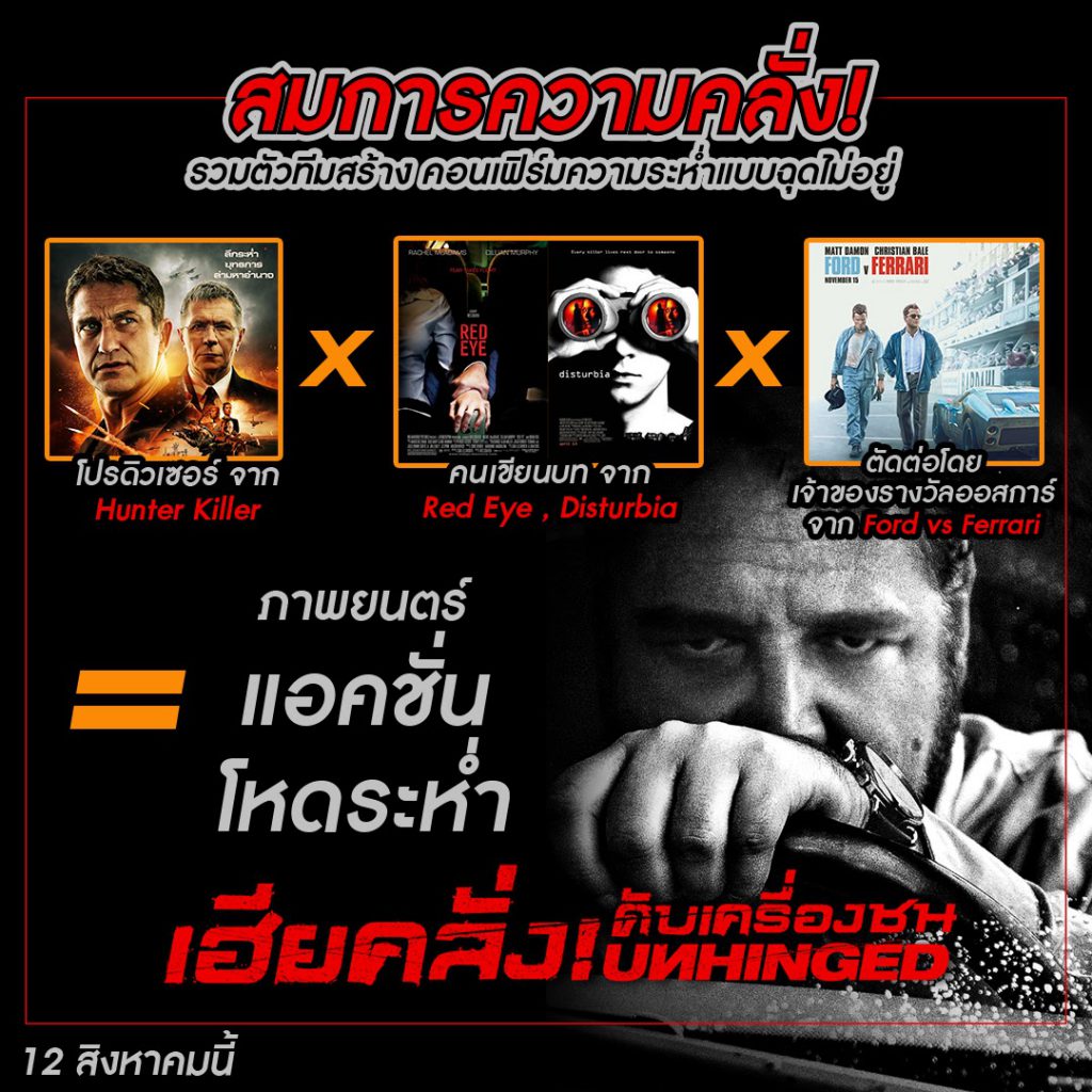 นอกจากคาแรคเตอร์สุดโต่งของ “รัสเซล โครว์” ในภาพยนตร์ล่าสุดของเขา Unhinged เฮียคลั่ง ดับเครื่องชน จะเป็นที่น่าจับตาแล้วนั้น อีกสิ่งหนึ่งที่เรียกความสนใจจากคอหนังได้ไม่แพ้กัน นั่นก็คือเหล่าทีมสร้างที่มีฝีมือและผลงานสุดโหดมาการันตีความมันส์ ไม่ว่าจะเป็นโปรดิวเซอร์สายแอคชั่น มาร์ค กิล กับผลงานสุดมันส์ที่คุ้นตาชาวไทยเป็นอย่างดี อย่าง Hunter Killer (2018) และได้มือเขียนคุณภาพ คาร์ล เอลส์เวิร์ธ ที่เคยฝากผลงานการเขียนชวนผวาไว้มากมาย ทั้ง Red Eye (2005), Disturbia (2007) และ The Last House on The Left (2009) แน่นอนว่าคราวนี้ คาร์ล จะมาถ่ายทอดประสบการณ์ปัญหาบนท้องถนนทั่วไป แบบเร่งดีกรีความเดือดจนถึงขั้นสุด เมื่อชายผู้ไม่มีอะไรจะเสียพร้อมทำทุกอย่างเพื่อมอบบทเรียนอันสาสมให้กับคนไร้มารยาท