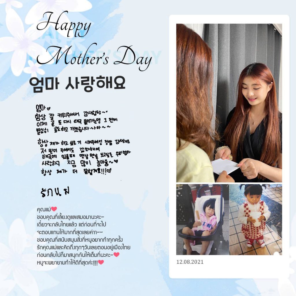 ด้าน มินซอ เปิดใจถึงคุณแม่ว่า “ขอบคุณที่คอยเลี้ยงดูหนู คุณแม่คอยสนับสนุนทุกกิจกรรมที่หนูอยากทำอยู่เสมอ คอยยินดี คอยปลอบเสมอ คุณแม่เป็นที่ปรึกษา เป็นทุกอย่างในชีวิต กับการมาทำงานที่เมืองไทยคุณแม่ก็สนับสนุนเต็มที่ หนูรักแม่นะคะ ตอนทำงานที่เมืองไทยหนูคิดถึงแม่ทุกวันเลย ตอนนี้อยู่เกาหลีก่อนจะกลับเมืองไทยเร็วๆนี้ หนูจะตอบแทนให้มากที่สุดเลยค่ะ”