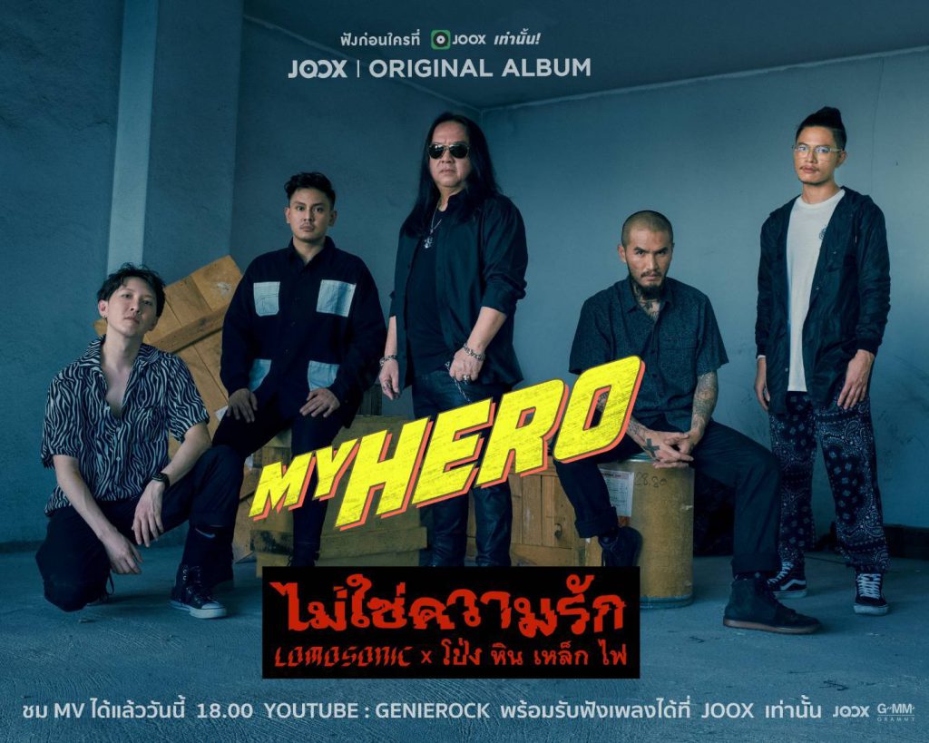 ศิลปินอีก 1 คู่ที่ได้ทำงานร่วมกันในโปรเจกต์ My Hero ก็คือ วงโลโมโซนิก และฮีโร่ในดวงใจของพวกเขา “โป่ง หิน เหล็ก ไฟ” งานนี้ จีเอ็มเอ็ม แกรมมี่ และ JOOX เปิดโอกาสให้ทั้งคู่ร้องด้วยกันในเพลง “ไม่ใช่ความรัก” เพลงที่โลโมโซนิกได้แรงบันดาลใจในการแต่งเนื้อเพลงมาจากเพลง เพื่อเธอ ของวง หิน เหล็ก ไฟ โดยมี อ๊อฟ บิ๊กแอส เป็นเอ็กเซ็กคูทีฟโปรดิวเซอร์ และยังได้ โป โปษยะนุกูล มาช่วยขัดเกลาเนื้อร้องให้สวยงาม โดย “บอย” นักร้องนำวง โลโมโซนิก เผยความในใจให้ฟังว่า