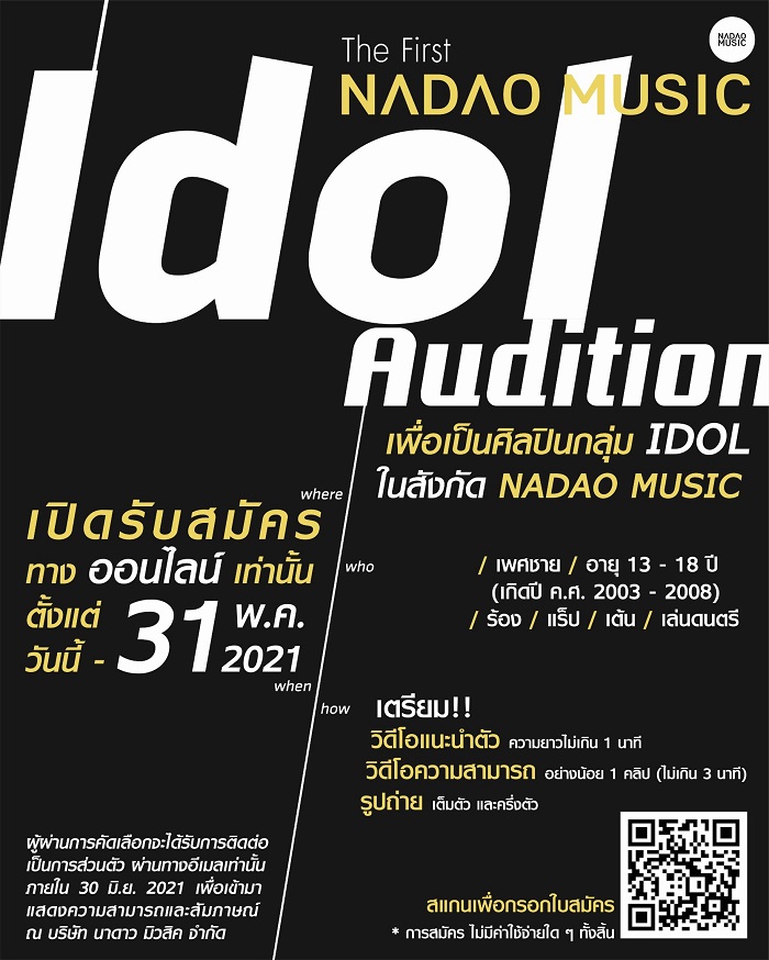 เป็นอีกโปรเจกต์ที่ไม่อยากให้พลาด!! เมื่อค่าย นาดาว มิวสิค เปิดโครงการ   The First Nadao Music Idol Audition”  โดยเปิดรับสมัครออดิชั่น  ค้นหาศิลปิน IDOL ชาย เพื่อเป็นศิลปินในสังกัด นาดาว มิวสิค  โดยผู้ที่สนใจสามารถกรอกใบสมัครออนไลน์  ซึ่งไฟล์ที่ต้องแนบส่ง ได้แก่ คลิปวิดีโอแนะนำตัว ความยาวไม่เกิน 1 นาที พร้อมด้วยคลิปวิดีโอความสามารถ อย่างน้อย 1 คลิป  ความยาวไม่เกินคลิปละ 3 นาที และรูปถ่ายแบบเต็มตัวและครึ่งตัว   เปิดรับสมัครตั้งแต่ วันนี้ – 31 พฤษภาคมนี้   โดยไม่เสียค่าใช้จ่ายใด ๆ ทั้งสิ้น   ซึ่งผู้ผ่านการคัดเลือกจะได้รับการติดต่อเป็นการส่วนตัวผ่านทางอีเมลเท่านั้น   (ภายในวันที่ 30 มิถุนายนนี้)  เพื่อเข้ามาแสดงความสามารถและสัมภาษณ์ ณ บริษัท นาดาว มิวสิค จำกัด