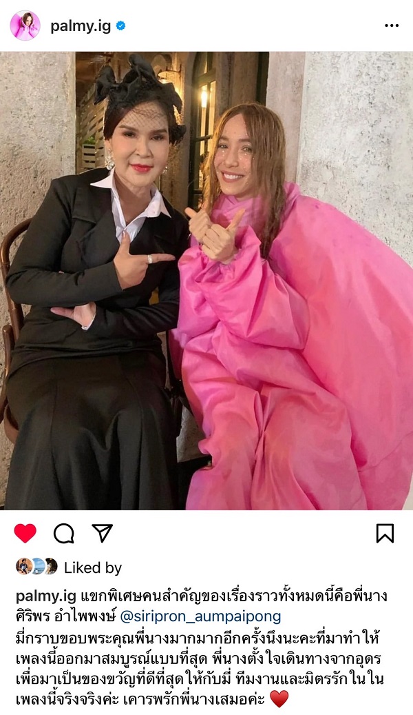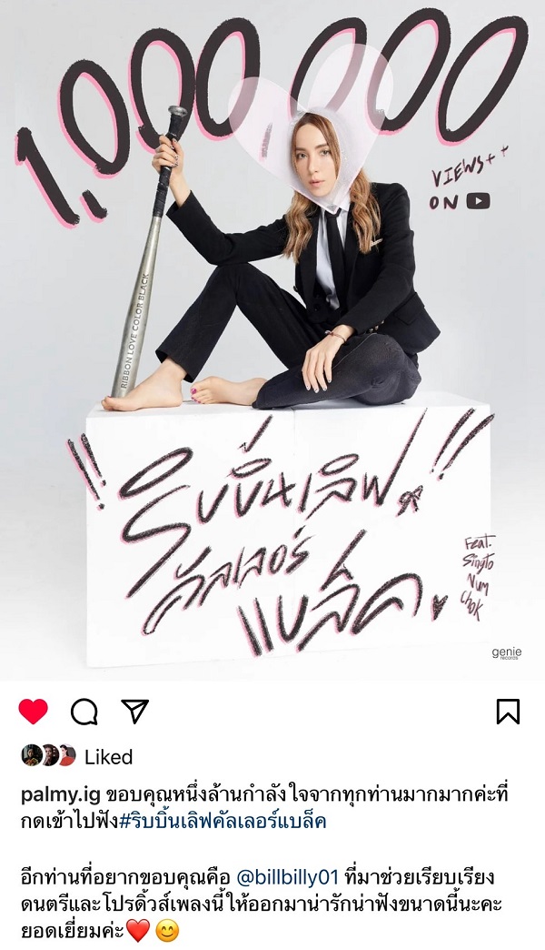 เมื่อเพลงใหม่ “ริบบิ้นเลิฟคัลเลอร์แบล็ค” ไปกระแทกใจมิตรรักจนคว้า 1 ล้านวิวแรกไปเรียบร้อย แถมยังพ่วงตำแหน่งเทรนด์ เพลงมาแรงอันดับที่ 4 ในยูทูปอีก งานนี้ “ปาล์มมี่” รีบโพสต์ขอบคุณกำลังใจจากมิตรรั กทันที ซึ่งถ้าใครได้ติดตามโซเชี ยลจะเห็นว่า ปาล์มมี่ไล่ขอบคุณทุกคนที่เกี่ ยวข้องมาตั้งแต่วันที่ปล่อยเพลง รวมไปถึงคลิปเบื้องหลังที่ปาล์ มมี่กลั้นน้ำตาแทบไม่อยู่ เมื่อได้เจอพี่นาง ศิริพร อำไพพงษ์ ศิลปินอันเป็นที่รั กของเธอและได้มาร่วมงานด้วยกั นจริงๆ พร้อมบอกด้วยเสียงที่สั่นเครื อว่า เข้าใจหัวอกแฟนคลับเวลาเฝ้ ารอและได้เจอศิลปินเป็นแบบนี้นี่ เอง งานนี้จะมีอะไรพิเศษออกมาอีกหรื อเปล่าต้องติดตาม เพราะขนาดวันแรกที่เปิดตัวเพลง “ริบบิ้นเลิฟคัลเลอร์แบล็ค” ยังจัดรถแห่เปิดเอ็มวีให้ผู้ คนย่านสี่แยกปทุมวันได้ฮือฮา คราวหน้าจะเป็นอะไรอีก..มิตรรั กลองทายกันดู