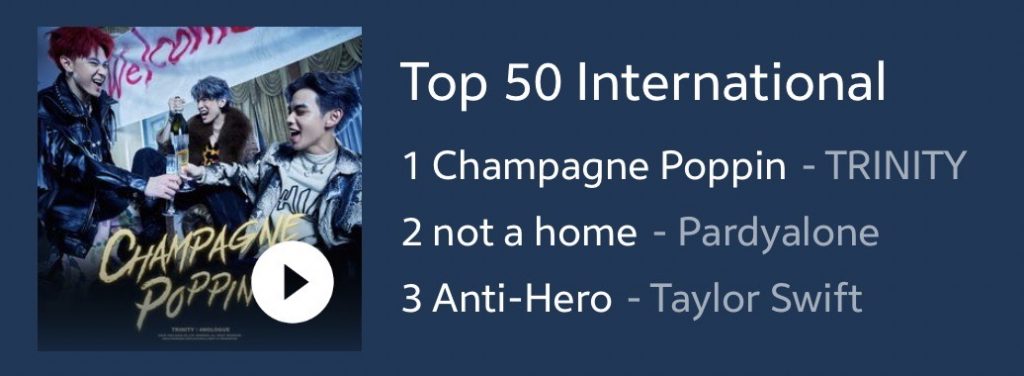 เรียกว่าหายเหนื่อยเลยก็ว่าได้สำหรับเพลงสากลเพลงแรกของ TRINITY (ทรินิตี้) ประกอบด้วย “เติร์ด-ปอร์เช่-แจ๊คกี้” ศิลปินในสังกัด 4NOLOGUE (โฟร์โนล็อค) ล่าสุดเพลง Champagne Poppin ขึ้นชาร์ต No.1 Thailand TOP 50 International เพลงสากลที่มีคนฟังมากที่สุดบนชาร์ต JOOX เป็นที่เรียบร้อย งานนี้ต้องขอบคุณ TWILIGHT (ทไวไลท์ : ชื่อแฟนคลับ) และแฟนเพลงทุกคนที่ช่วยกันสนับสนุน