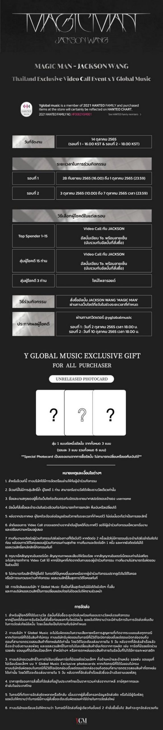 กรี๊ดสนั่น เมื่อหนุ่มสุดฮ็อต Jackson Wang จับมือกับ Y Global Music จัดเต็มจัดหนักให้กับอากาเซ่ชาวไทย จัดงาน “JACKSON WANG – MAGICMAN Thailand Exclusive Video Call Event x Y Global Music” ในวันศุกร์ที่ 14 ตุลาคม 2565 จัดเต็ม 2 รอบแบบจุใจ รอบที่1 เวลา 16.00 น. [ตามเวลาเกาหลี] และรอบที่ 2 เวลา 18.00 น. [ตามเวลาเกาหลี]
