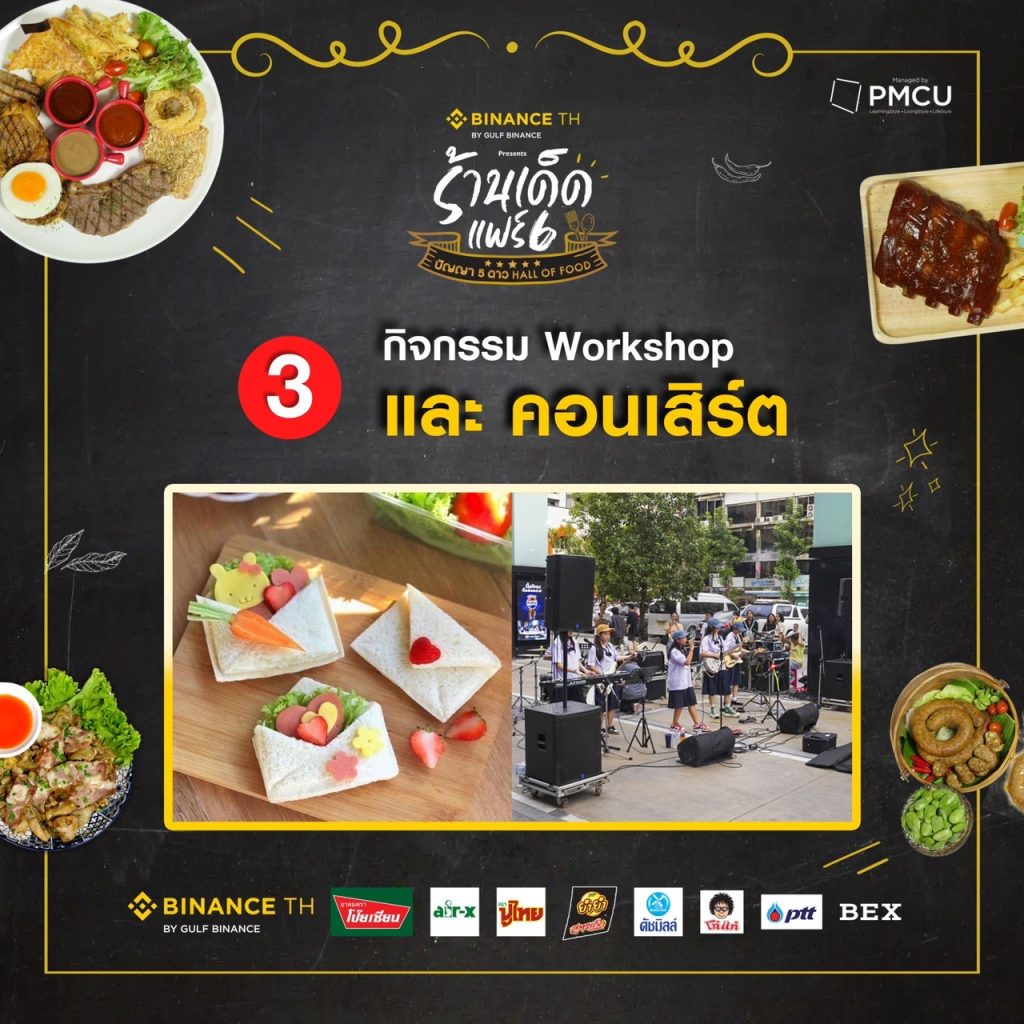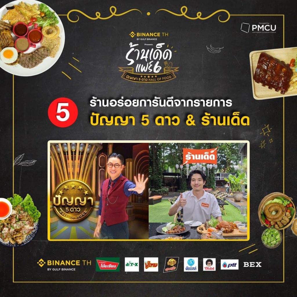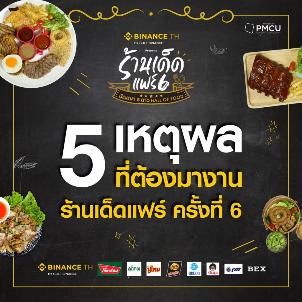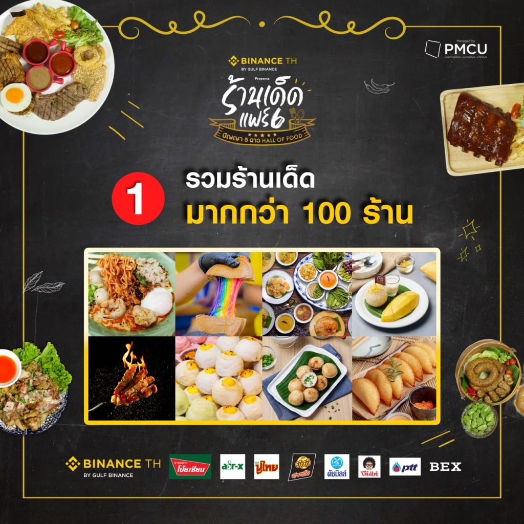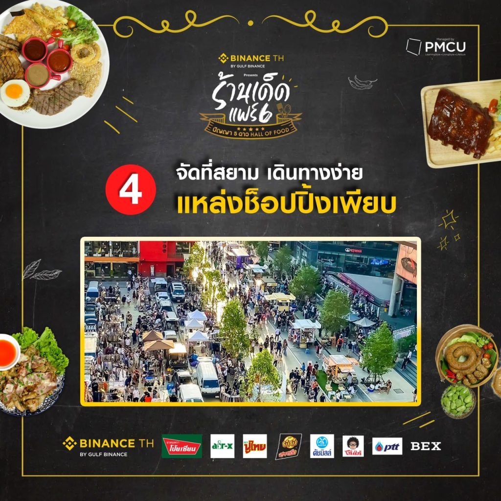สายชิม สายกิน เตรียมกระเพาะไว้ให้ดี งานนี้จะได้สนุก จุก ฟิน ไปกับงานอาหารใจกลางเมืองสุดยิ่งใหญ่แห่งปี ที่กำลังจะกลับมาให้ได้ลิ้มรสเด็ดกันอีกครั้ง!! กับงาน “BINANCE TH แพลตฟอร์มเทรดสินทรัพย์ดิจิตอลมาตรฐานโลก presents ร้านเด็ดแฟร์ 6 ปัญญา 5 ดาว Hall of Food” ชวนสายชิลล์ สายกิน มาร่วม กิน สนุก จุก ฟิน ไปกับร้านเด็ด ชื่อดังทั่วไทย การันตี รสชาติ รสมือ ความอร่อย ความเด็ดสุดปัง จากรายการปัญญา 5 ดาวยกทัพมามากมายกว่า 50 ร้าน และ ร้านเด็ดทั่วไทย พร้อมใจกันจับตะหลิว เคาะกระทะ มาเข้าร่วมสร้างความสุข มากกว่า 60 ร้าน รวมแล้วเป็นร้อยกว่าร้าน ที่จะมาสร้างความจุก สนุก สุดฟิน เรียกว่า เป็นงานอาหารหลากหลาย นานาชนิด ที่ ปัง สุด ในสยาม งานนี้พร้อมเสิร์ฟให้ได้ฟินกันแบบจุใจ พุงไม่แตก ไม่ให้กลับ!! ไม่ว่าจะเป็นอาหารคาว หวานปรุง สด ใหม่ ให้ได้ชิมกันแบบจุใจกันในงาน, ขนม นม เนย ของกินเล่นสุดเก๋, น้ำหวานอร่อยสูตรเด็ด หลากชนิด ต่างพาเหรดมาร่วมสร้างสีสันความอร่อย ให้ทุกท่านทั้งชาวไทย และ นักท่องเที่ยวชาวต่างชาติ ได้ลองลิ้ม ชิม รส กันแบบฟินสุดๆ งานนี้ห้ามพลาด!!