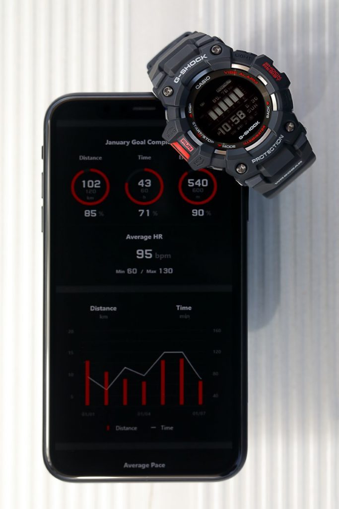 ประเดิมความพิเศษกับเทรนนิ่งวอทช์รุ่นใหม่มาแรงอย่าง G-SQUAD GBD-H1000 ที่มาพร้อมระบบเซ็นเซอร์อัจฉริยะทั้งหมด 5 ตัว ได้แก่ เซ็นเซอร์อัตราการเต้นหัวใจ (HRM), เซ็นเซอร์วัดระดับความสูง (Altitude), เซ็นเซอร์วัดความกดอากาศ (Barometric Pressure Altitude Sensor), เซ็นเซอร์วัดอุณหภูมิ (Thermo Sensor), เซ็นเซอร์เข็มทิศ (Compass) และเซ็นเซอร์จับความเคลื่อนไหว (Accelerometer Sensor) รวมถึงรองรับการคำนวณค่าการใช้ออกซิเจนสูงสุด (VO2max) ที่ใช้อัตราการเต้นของหัวใจและความเร็วเพื่อเป็นตัวชี้วัด บ่งบอกถึงความแข็งแรงของหัวใจและปอดของผู้สวมใส่ และมีประโยชน์อย่างยิ่งเมื่อต้องการเพิ่มความทนทานในการวิ่งและกิจกรรมการเทรนนิ่งอื่นๆ โดยการวัดค่าและวิเคราะห์ข้อมูลนี้ สามารถเชื่อมต่อกับสมาร์ทโฟนในแบบไร้สายผ่านระบบ Bluetooth® เพื่อใช้งานควบคู่กับแอปพลิเคชั่น G-SHOCK MOVE