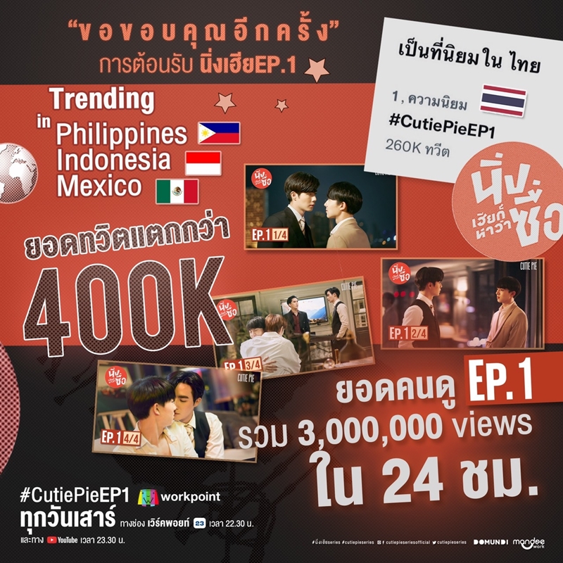ติดตามความเข้มข้น ความขี้อ้อน และ ความปากแข็ง ของหนูเกื้อและเฮียเหลียนจากซีรีส์ “นิ่งเฮียก็หาว่าซื่อ Cutie Pie Series” ได้ทางช่อง Workpoint กด 23 ทุกวันเสาร์ เวลา 22.30 น. และรับชมย้อนหลังแบบทั่วโลกทางช่อง Youtube : mandee channel เวลา 23.30 น.