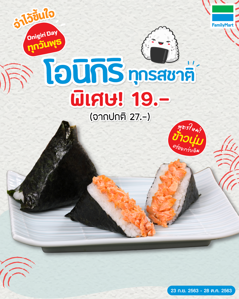 แฟมิลี่มาร์ท จัดโปรพิเศษ Onigiri Day ทุกวันพุธ โอนิกิริทุกรสชาติ พิเศษราคาเดียว 19 บาท จากปกติ 27 บาท มาพร้อมสูตรใหม่ รสชาติเข้มข้น ข้าวหอมนุ่ม ไส้แน่น อร่อยกว่าเดิม อาทิ ข้าวปั้นโอนิกิริไส้สลัดไข่กุ้ง, ข้าวปั้นโอนิกิริไส้สลัดทูน่า, ข้าวปั้นโอนิกิริไส้แซลม่อนย่างเกลือ, ข้าวปั้นโอนิกิริไส้สลัดไข่หวานไข่กุ้ง และ ข้าวปั้นโอนิกิริไส้แซลมอนเทอริยากิ ข้าวโอนิกิริเมนูข้าวปั้นสามเหลี่ยมที่ครองใจทุกเพศ ทุกวัย ทั้งนักเรียน นักศึกษา พนักงานออฟฟิศ หรือคนทำงานที่ใช้เวลาเร่งรีบ อิ่มอร่อย สะดวก ทุกที่ ทุกเวลา แล้วมาฟินในราคาโดนๆได้ที่แฟมิลี่มาร์ท ทุกสาขา ตั้งแต่วันที่ 23 กันยายน – 28 ตุลาคม 2563 ติดตามรายละเอียดเพิ่มเติมได้ที่ เฟสบุค FamilyMart Thailand หรือ แอพพลิเคชั่นไลน์ @FamilyMartThailand