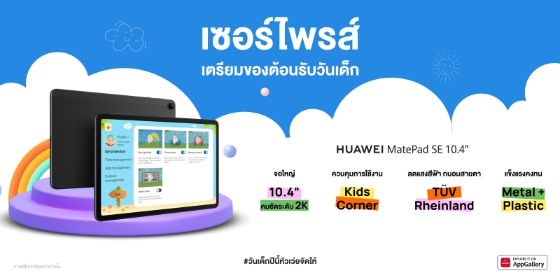 หัวเว่ย คอนซูมเมอร์ บิสสิเนส กรุ๊ป (ประเทศไทย) แนะนำ 2 แก็ดเจ็ตสุดอัจฉริยะสำหรับใครที่กำลังมองหาของขวัญเซอร์ไพรส์ในวันเด็กที่กำลังจะมาถึงนี้ เริ่มด้วย HUAWEI MatePad SE 10.4” แท็บเล็ตหน้าจอใหญ่ระดับ 2K เสมือนเพื่อนคู่ใจลูกน้อยช่วยเสริมสร้างทักษะการเรียนรู้และจิตนาการได้อย่างไม่มีที่สิ้นสุด ผู้ปกครองสามารถวางใจกับโหมดช่วยดูแลการใช้งานแท็บเล็ตอย่างเหมาะสมผ่าน Kids Corner และ HUAWEI WATCH KIDS 4 Pro สมาร์ทวอทช์สำหรับเด็กผู้ช่วยดูแลทั้งความปลอดภัยและสุขภาพของลูกน้อย ติดตั้งกล้องในตัวความละเอียด 5 MP ที่สามารถถ่ายทั้งภาพและวิดีโอคอลได้คมชัดระดับ HD พบกับโปรพิเศษลดสูงสุดกว่า 29% พร้อมของแถมมูลค่าสูงสุดถึง 1,439 บาท และรับคูปองส่วนลดสูงถึง 100 บาท เมื่อสั่งซื้อตั้งแต่ 8 มกราคม 2566 ถึง 11 มกราคม 2566 ที่ HUAWEI Store และร้านค้าอย่างเป็นทางการของหัวเว่ยบน Shopee และ Lazada กดใส่ตะกร้ารอเลย!